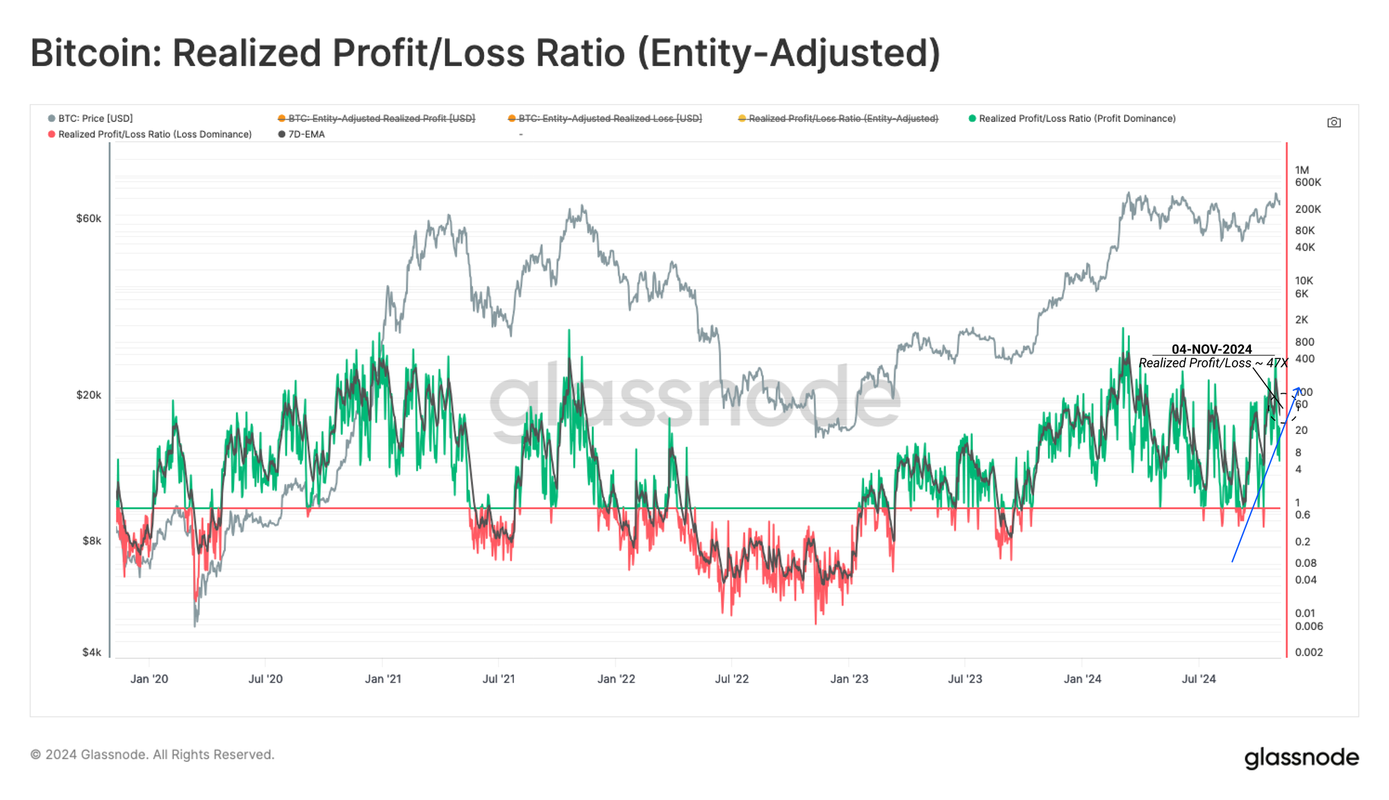 The market currently resides in a profit-dominant regime, with the volume of profit realized being a staggering ~47x larger than losses. This reflects the increasingly thin volume of supply held at a loss as the market pushes up to and through to a new ATH.