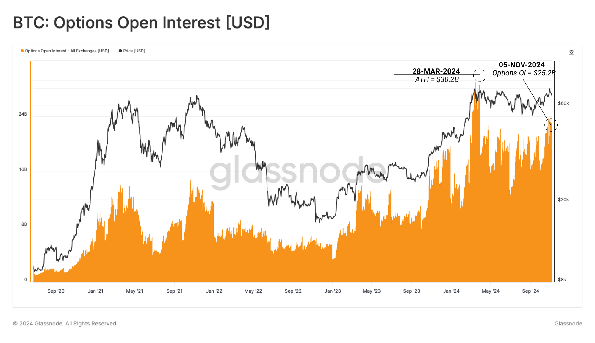 The US Presidential Election has been a dominant focal point for investors, with expectations for heightened volatility being priced in for several weeks. Since 2023, options markets have grown to become a significant component of the Bitcoin market structure, enabling investors to express increasingly sophisticated views on the market.