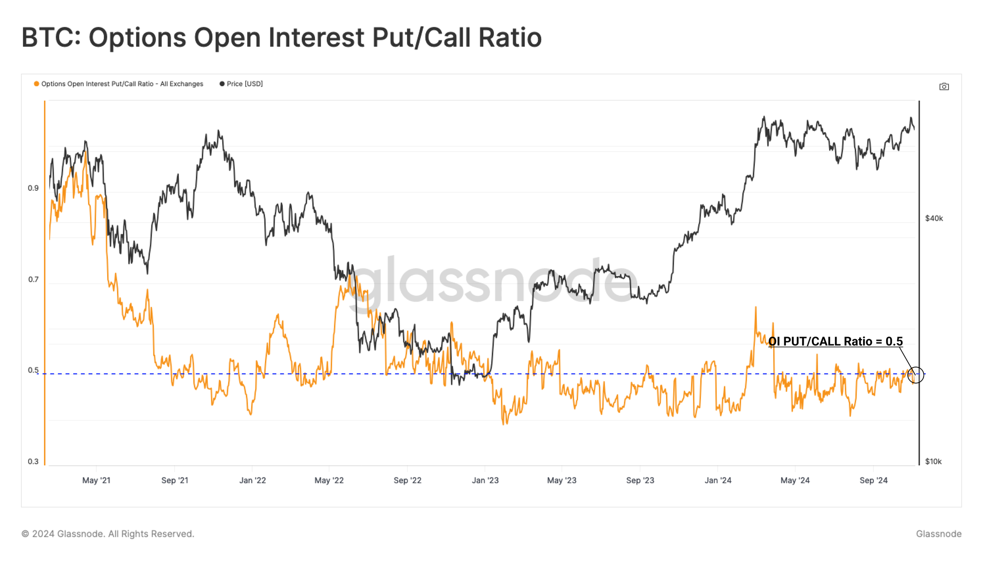 Assessing the ratio between open interest allocated to put and call contracts, there is an even split between both sides. This suggests that investors and speculators have hedged and bet on large market moves in both market directions.