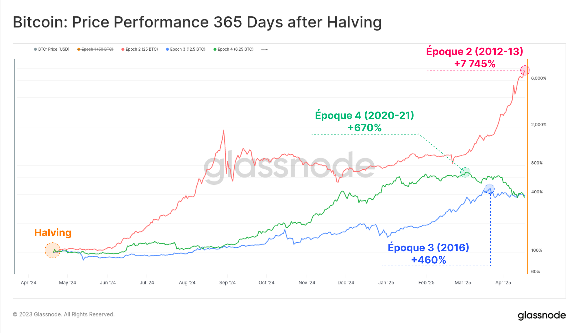 Outre l’élégance technique et le caractère inéluctable du halving, c’est également un point d’intérêt pour les investisseurs. Toutes les halvings précédents ont connu des performances de marché impressionnantes au cours des 365 jours qui ont suivi.
