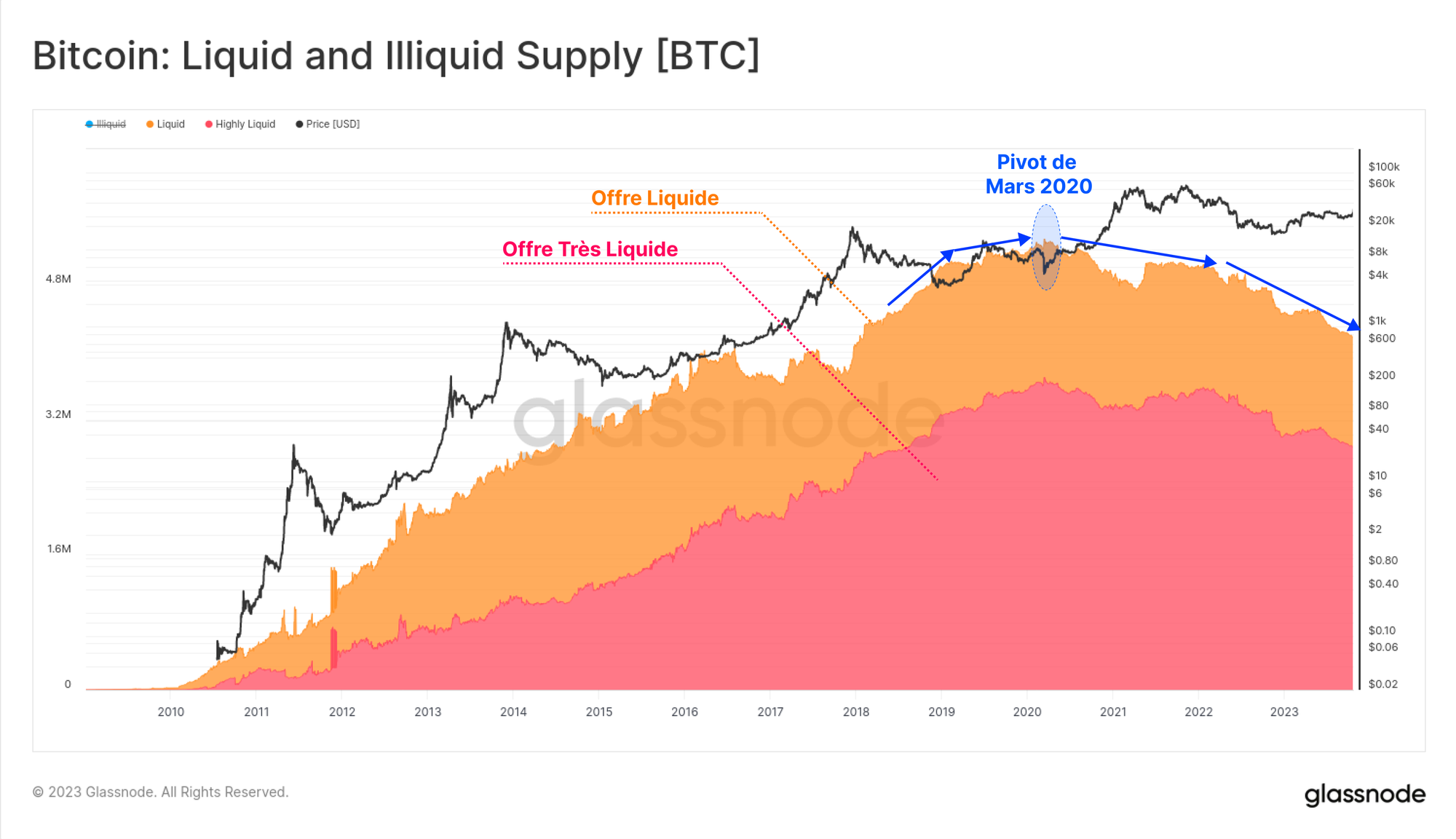 Glassnode a développé une autre heuristique de l'offre qui surveille le comportement de dépenses des portefeuilles, classés en catégories Illiquide, Liquide et Très liquide.