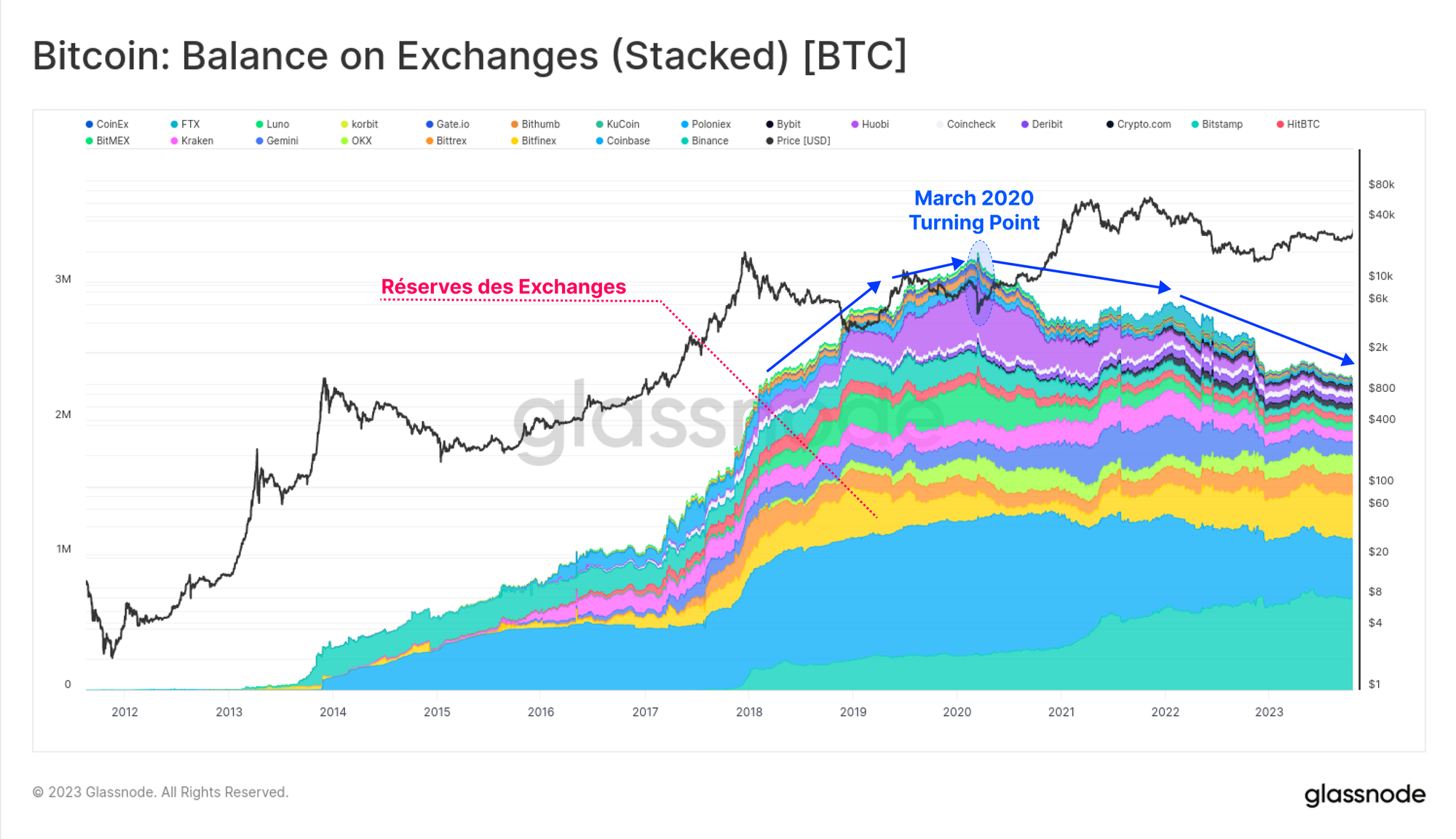 Les soldes des exchanges présentés sont dérivés de la base de données de Glassnode, qui sont rassemblées à la fois grâce à des informations d'exchanges officiellement publiées et à des algorithmes de clustering propriétaires. Bien que nous nous efforcions d’assurer la plus grande précision dans la représentation des soldes des exchanges, il est important de noter que ces chiffres ne reflètent pas toujours l’intégralité des réserves d’un exchange, en particulier lorsque les ce dernier s’abstient de divulguer ses adresses officielles. Nous invitons les utilisateurs à faire preuve de prudence et de discrétion lorsqu'ils utilisent ces mesures. Glassnode ne pourra être tenu responsable de toute divergence ou inexactitude potentielle. Veuillez lire notre avis de transparence lorsque vous utilisez des données relatives aux exchanges.