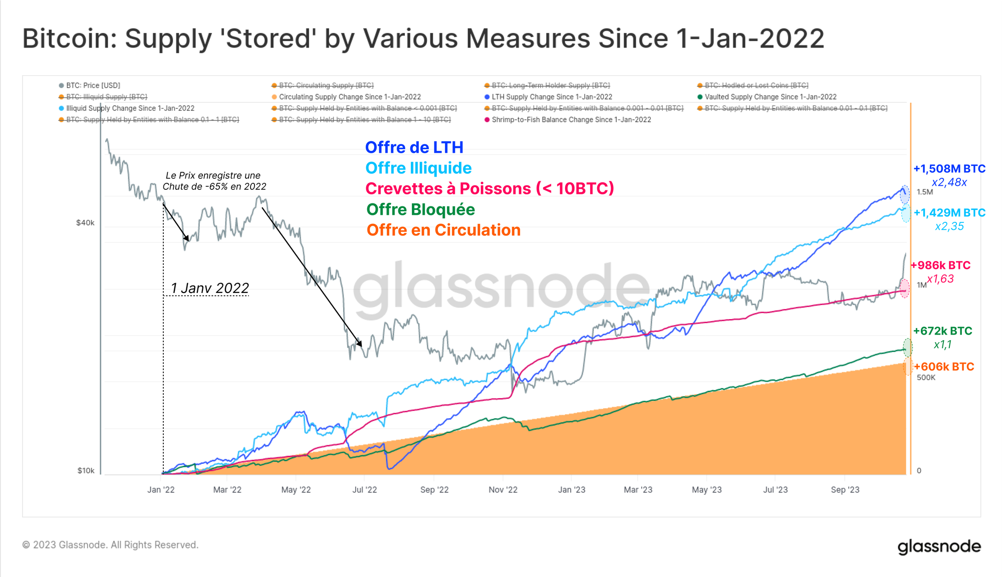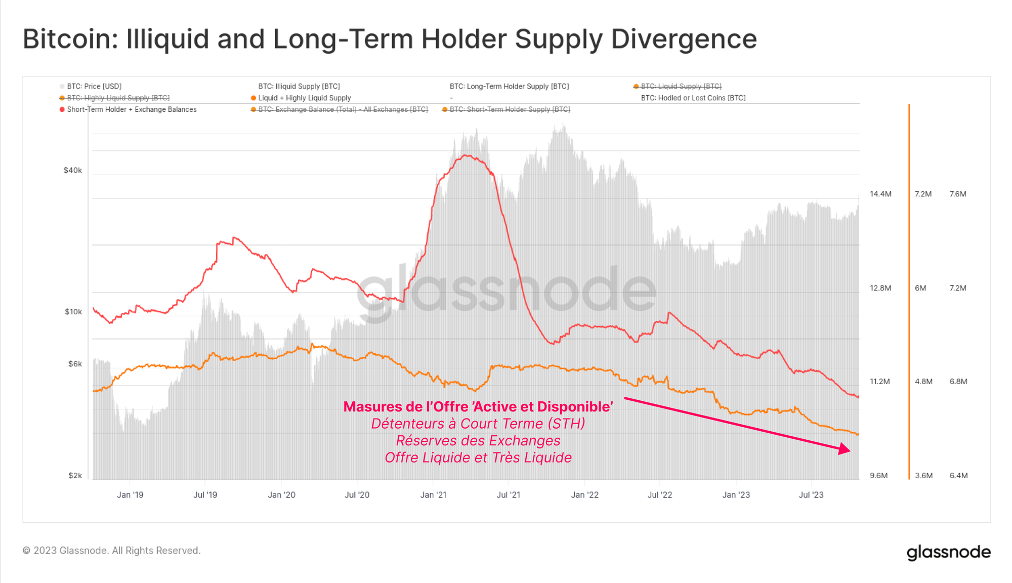 Nous avons établi que la tendance générale de diverses mesures de « l'offre disponible » est à la baisse. Cette tendance date maintenant de quelques années, mais s'est notamment accélérée depuis la vente massive du marché en juin 2022 (LUNA-UST et 3AC).