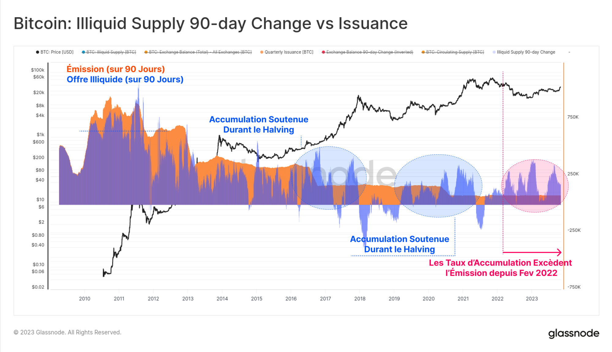 L’offre illiquide augmente actuellement à un taux de 180 000 BTC/trimestre, soit 2,2 fois plus que l’émission.