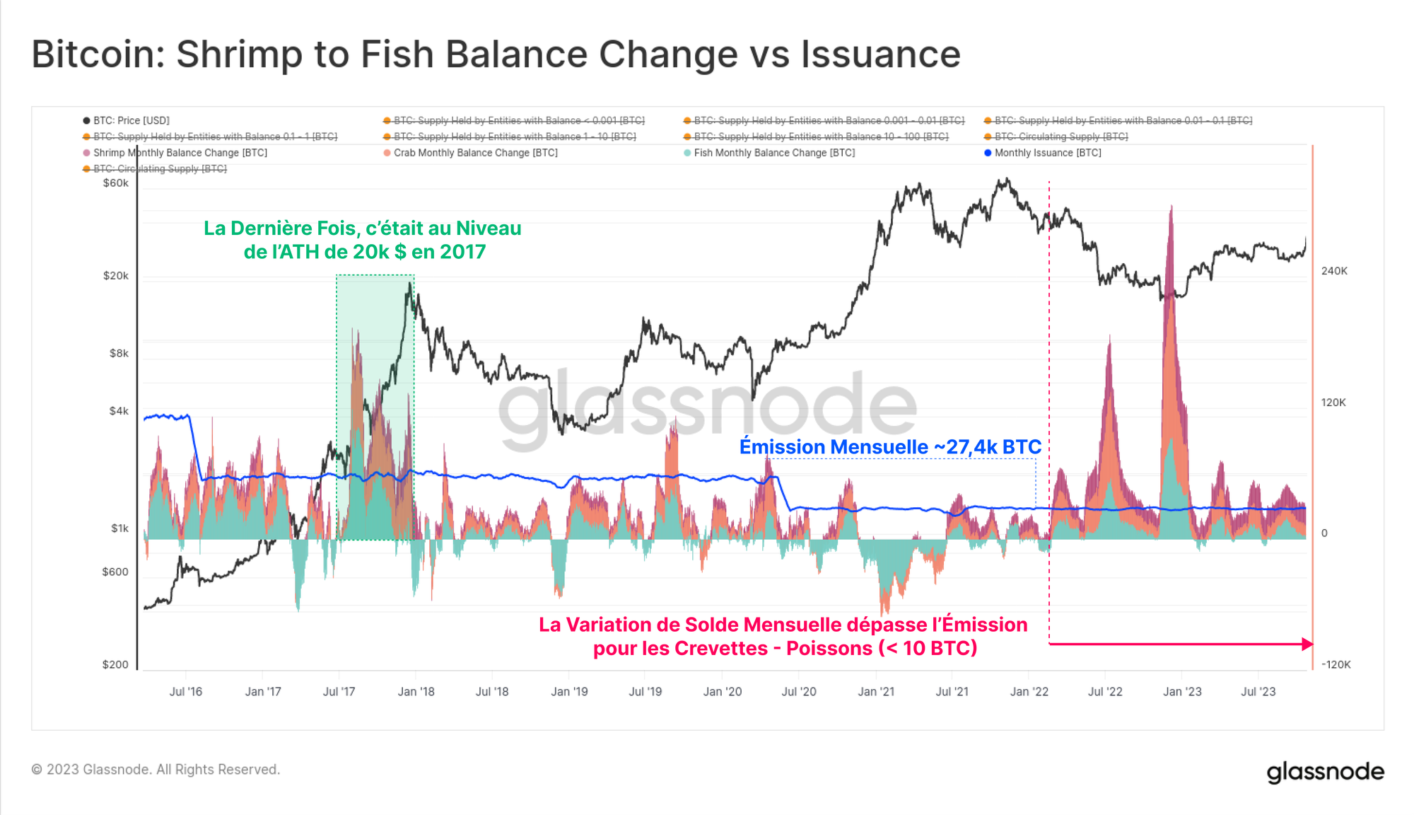 Ces crevettes (< 1 BTC), crabes (1 à 10 BTC) et poissons (10 à 100 BTC) capturent un large éventail d'investisseurs, du détail aux particuliers fortunés.