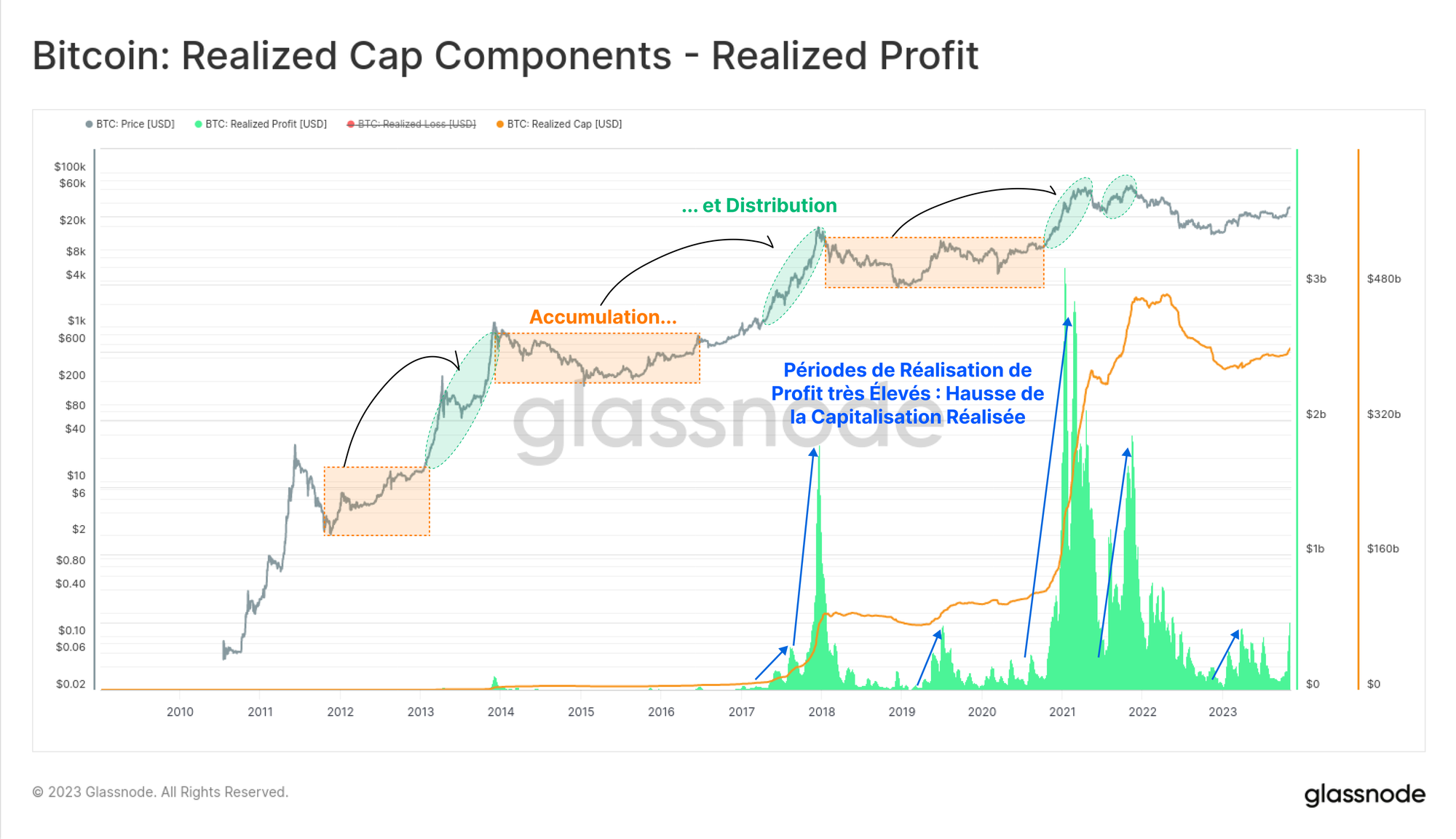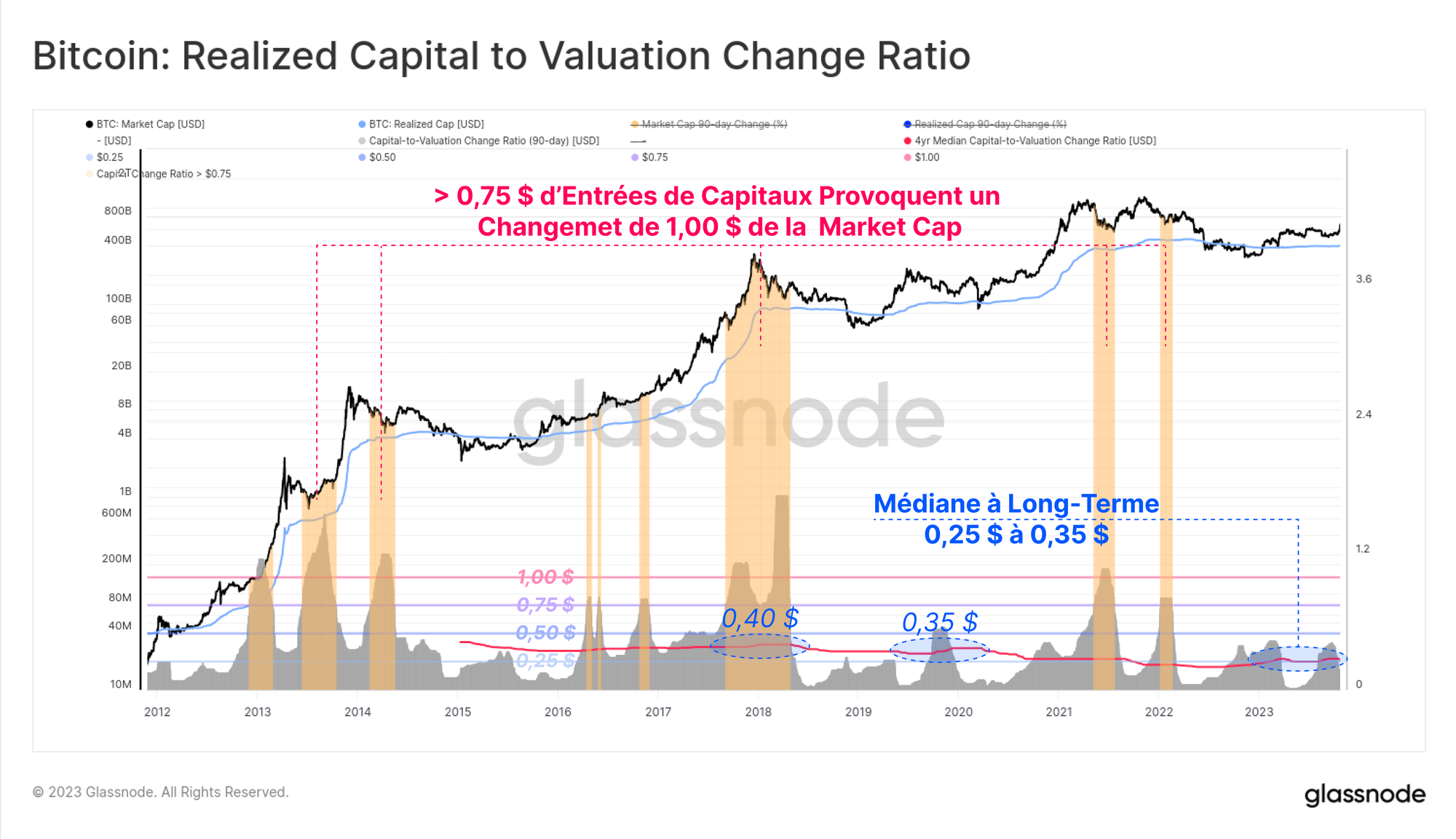 - En utilisant une relation entre la capitalisation boursière et la capitalisation réalisée, nous estimons que cette tension de l'offre se traduit par des entrées de capitaux vers le BTC et qu'elles ont un impact démesuré sur sa valorisation.