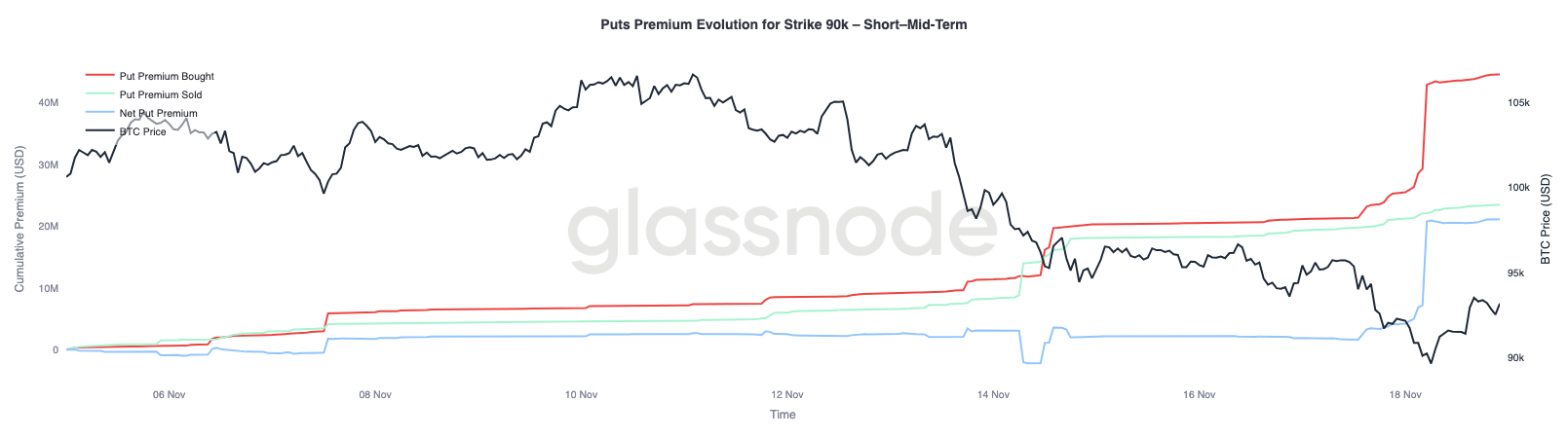 Continuing from the broader flow data, the 90K strike put premiums show how protection demand accelerated as price weakened. Over the last two weeks, the net put premium at this strike stayed relatively balanced until Bitcoin broke below the 93,000 level. Once that level failed, traders lifted the offer on these puts, driving a sharp increase in premium bought at the 90K strike.