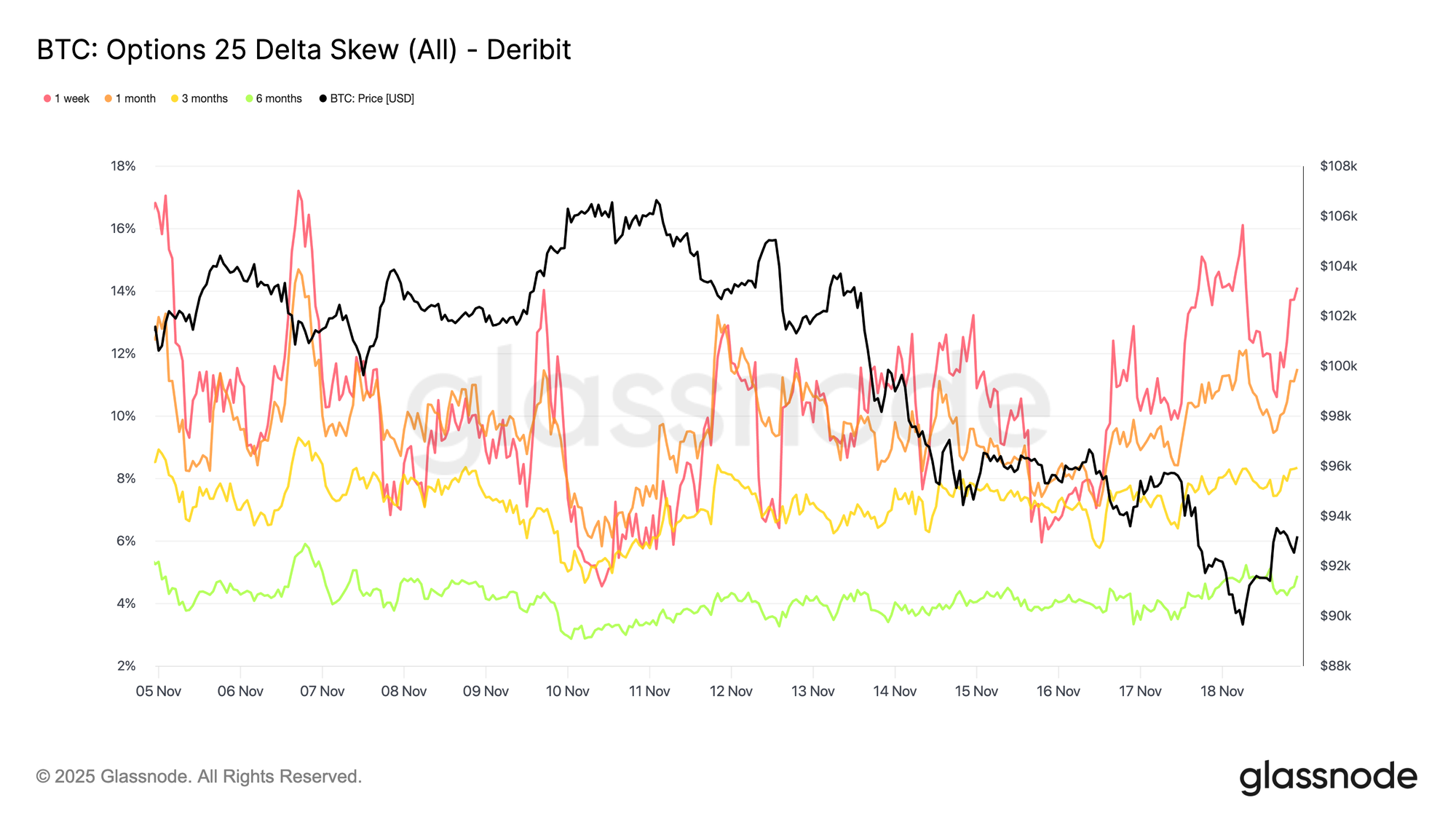 Implied volatility is now close to the levels seen during the October 10 liquidation event, showing how rapidly traders have reassessed near-term risk.