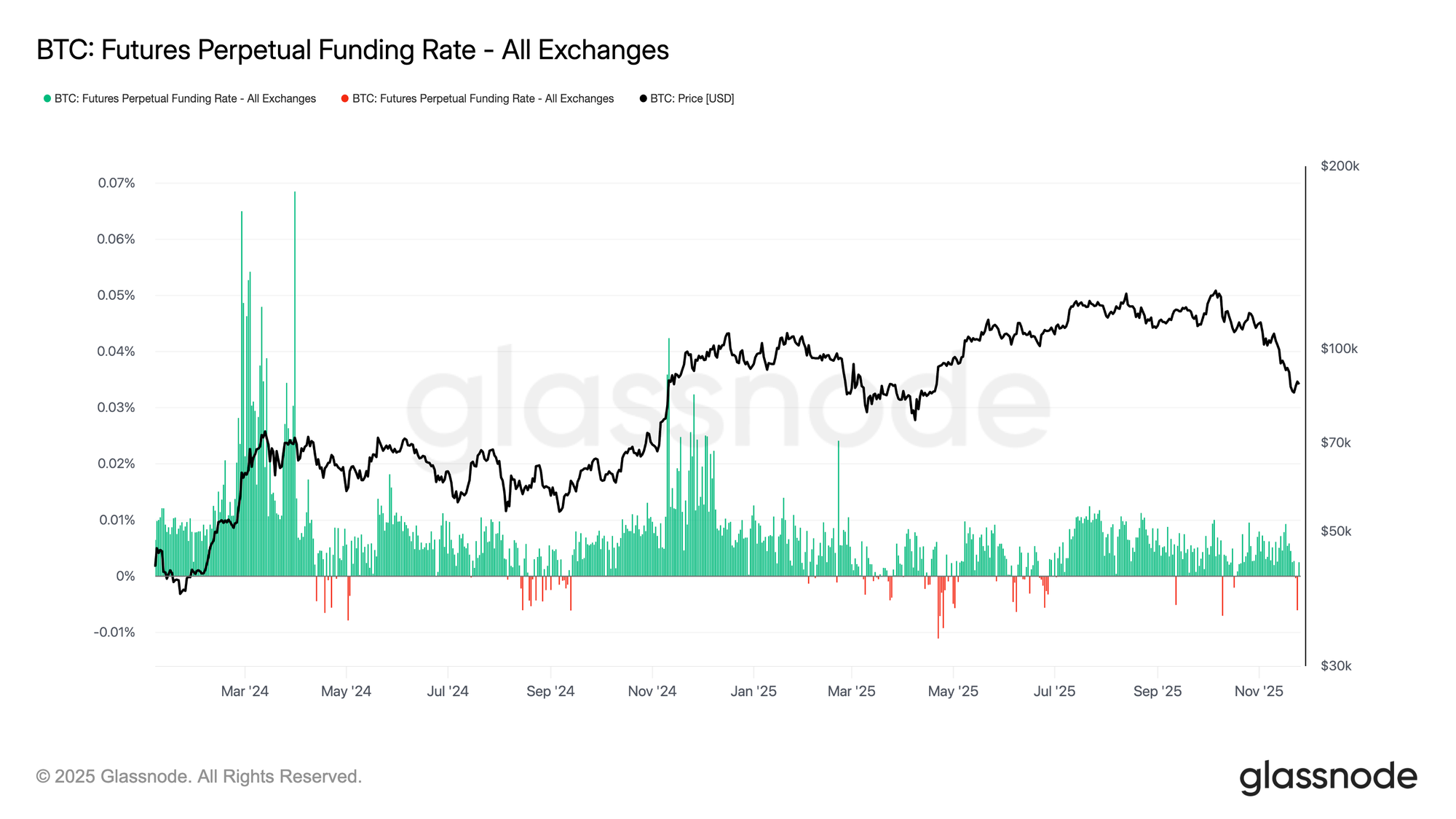 In parallel to the drop in open interest, perpetual funding rates have hovered near neutral, with occasional dips into negative territory. This marks a clear shift from the consistently positive funding typical of more speculative phases, signalling a more balanced and cautious derivatives environment.