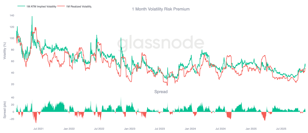 Following the shift in skew, volatility itself is beginning to move back toward more typical levels. Recent patterns show a clear mean reversion, suggesting that volatility sellers are stepping back in, though implied volatility still sits above what the market has delivered in recent sessions. One-month implied volatility remains elevated, even after the short end dropped roughly 20 vol points from its peak earlier in the week and about 10 vol points from levels seen in recent days. This retracement indicates that part of the stress premium is being unwound.
