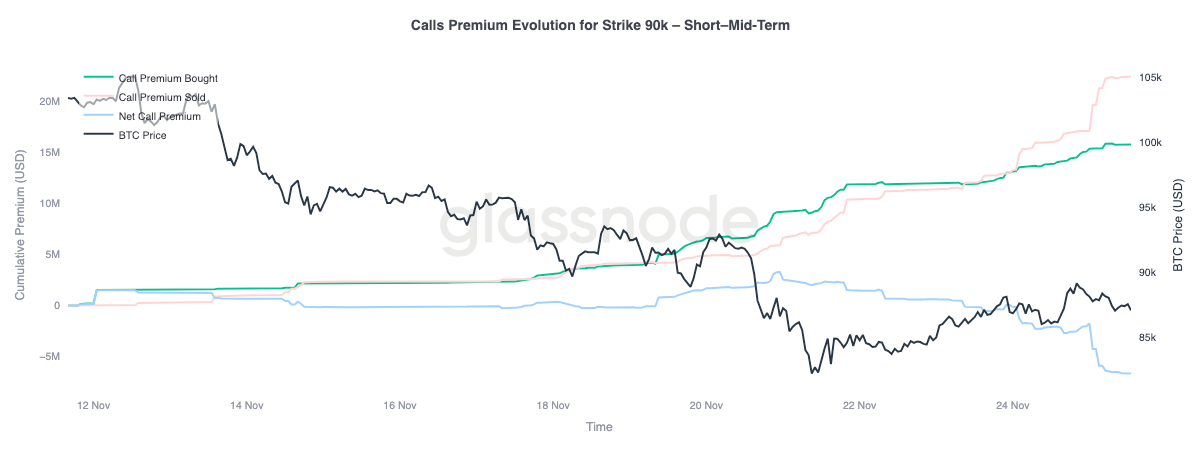 Looking at flows on the upside provides a contrasting message. Even though the market now sees a reduced risk of an immediate crash, it does not yet believe in a sustained recovery. The preference has been to fade attempts to reclaim the 90,000 level rather than position for a breakout, highlighting that confidence in the rebound remains limited.