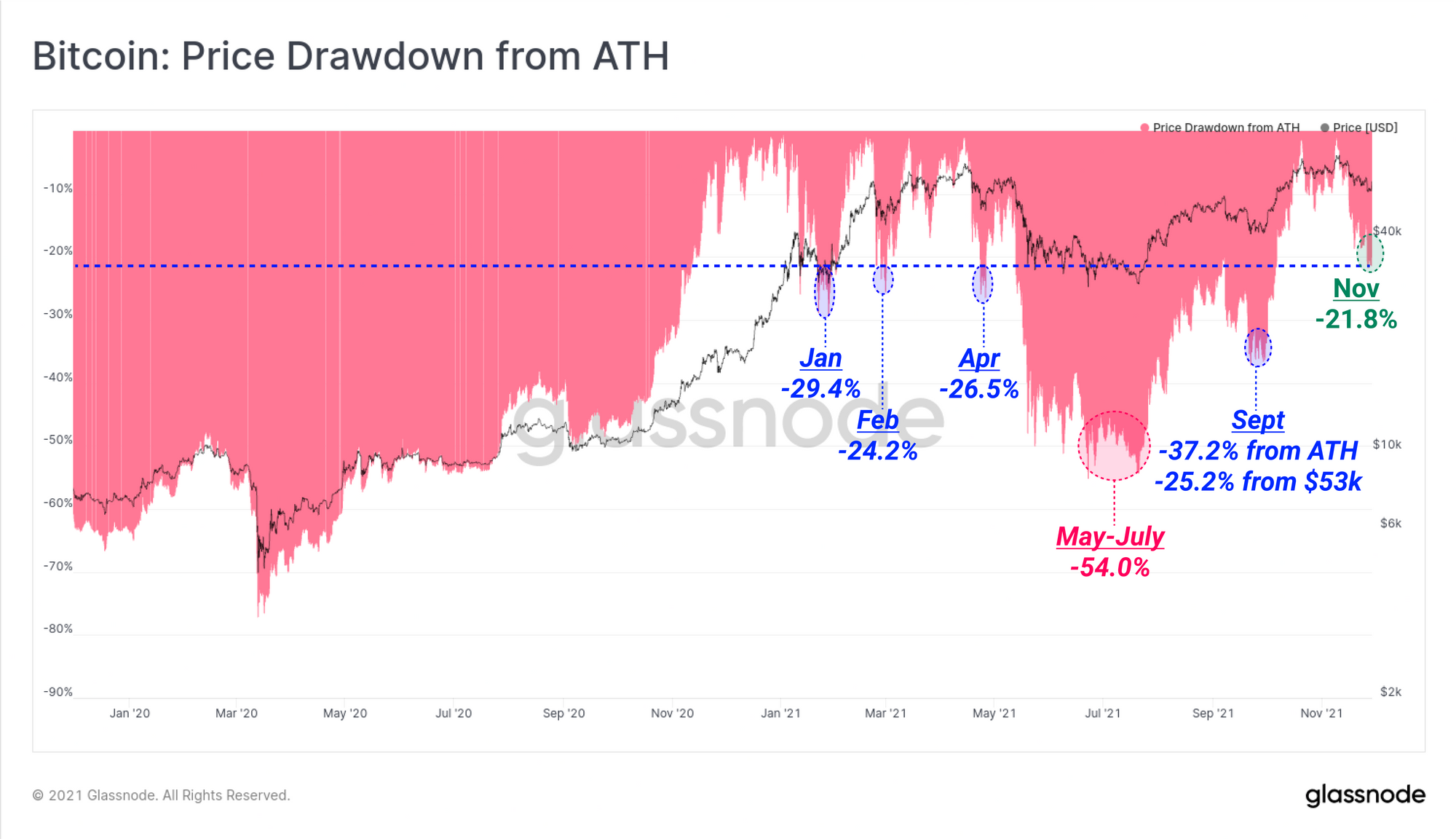 Sell-offs in Jan, Feb and April all reached drawdowns as deep as -24.2% from the ATH before reverting. The deepest drawdown this year was obviously the period from May to July, where the market reached a -54% drawdown at the lows. The most recent correction in September was actually the second deepest, reaching -37.2% from April's ATH, and 25.2% off the local high of $53k.