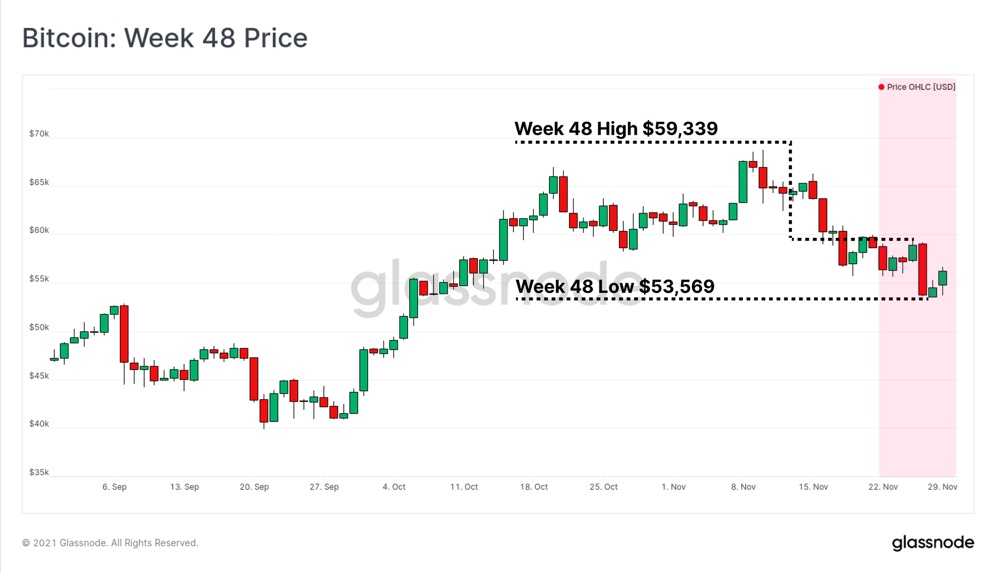 Bitcoin traded lower this week, alongside weakness across many traditional assets, largely due to renewed concerns over new virus variants. Bitcoin's price opened at a high of $59,339, and reached the lowest price for the month of $53,569. This continues the price correction that has been in play for most of November.