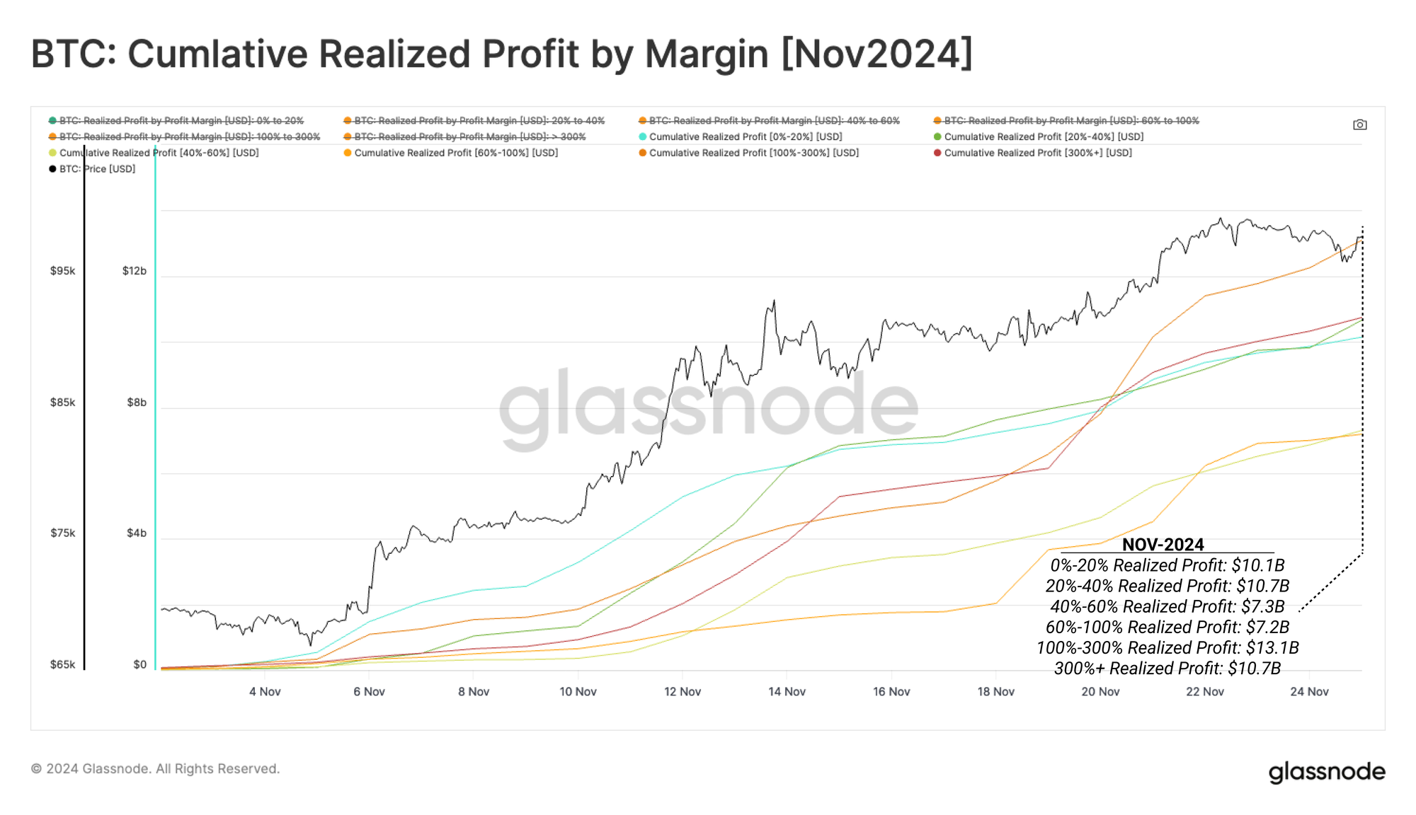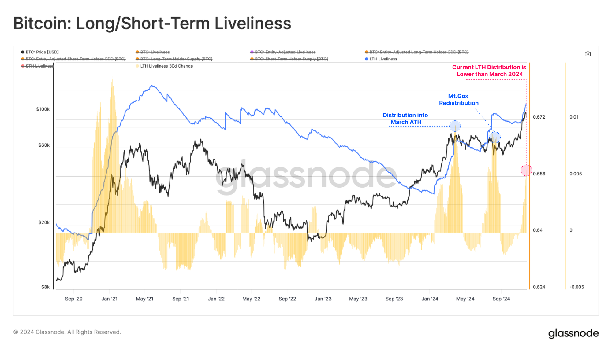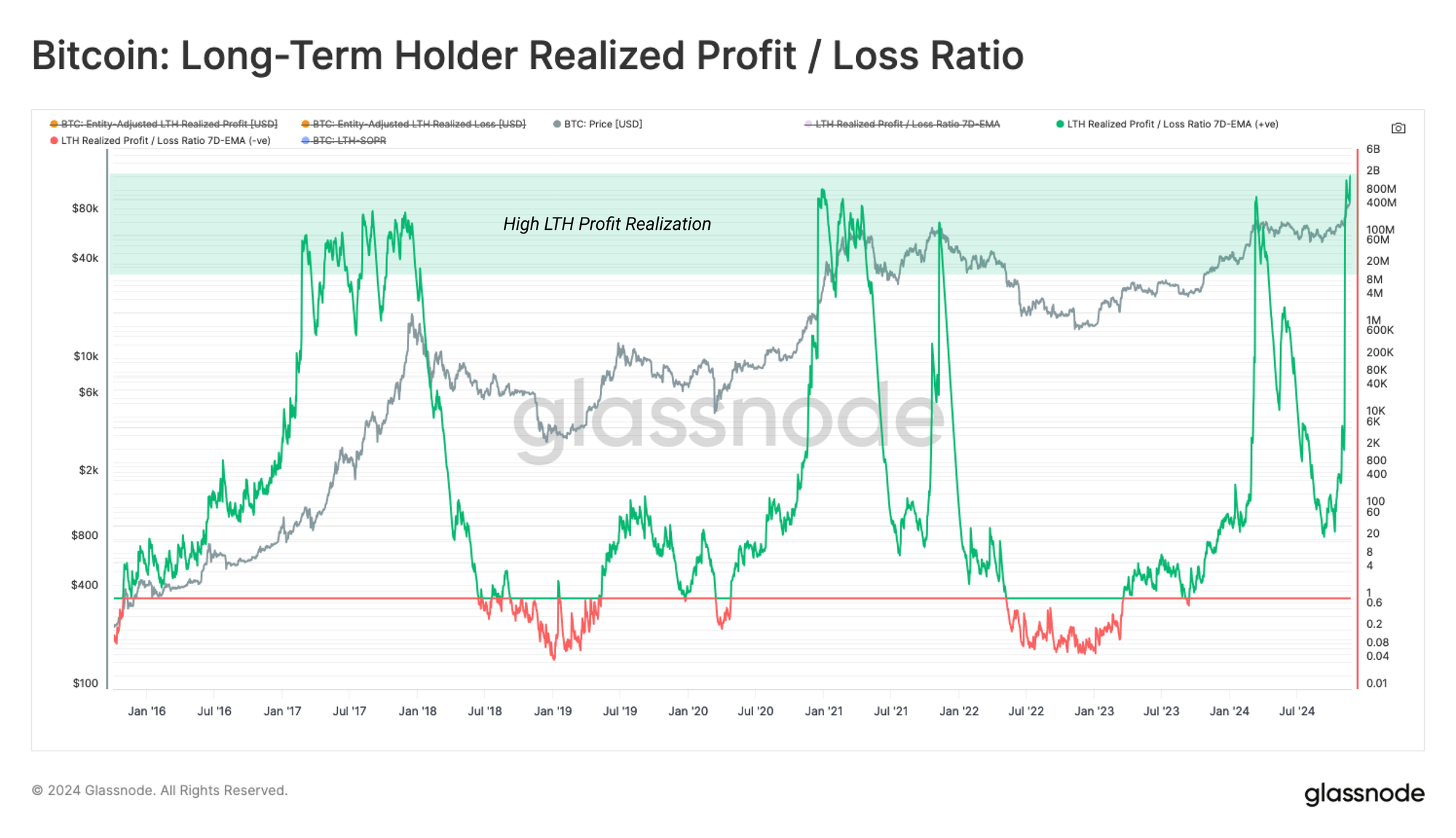 Following a flurry of consistent new ATHs, Bitcoin is just a stone's throw away from reaching a price of $100k per coin. Explosive price action tends to result in a significant increase in the unrealized profit of holders, and Long-Term Holders are ramping up their distribution in response.