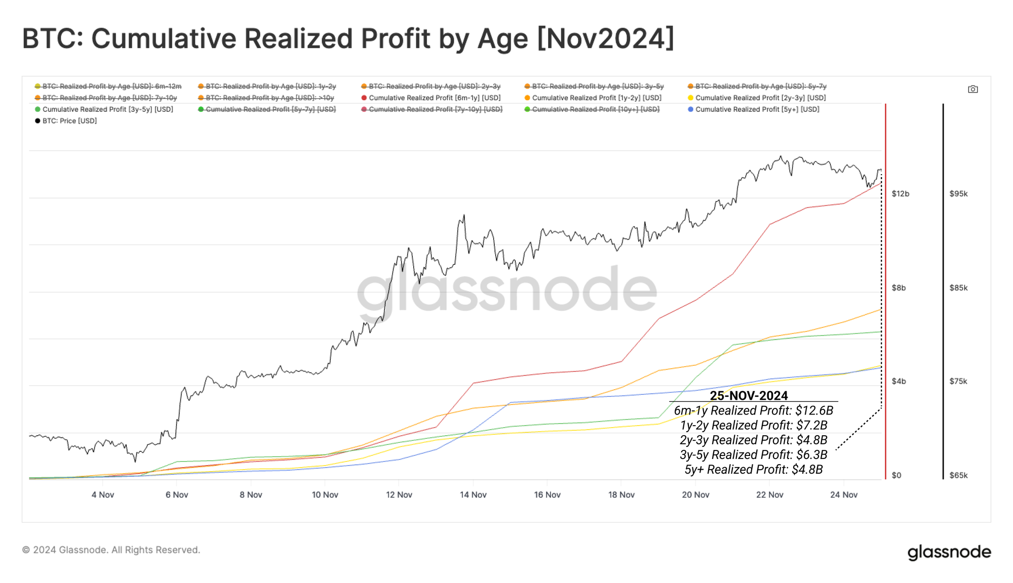 We can utilize our age breakdowns of the realized profit metric to evaluate which sub-cohorts are contributing the most to sell-side pressure. Here, we calculate the cumulative profit-taking volume by age since the start of the Nov-2024.