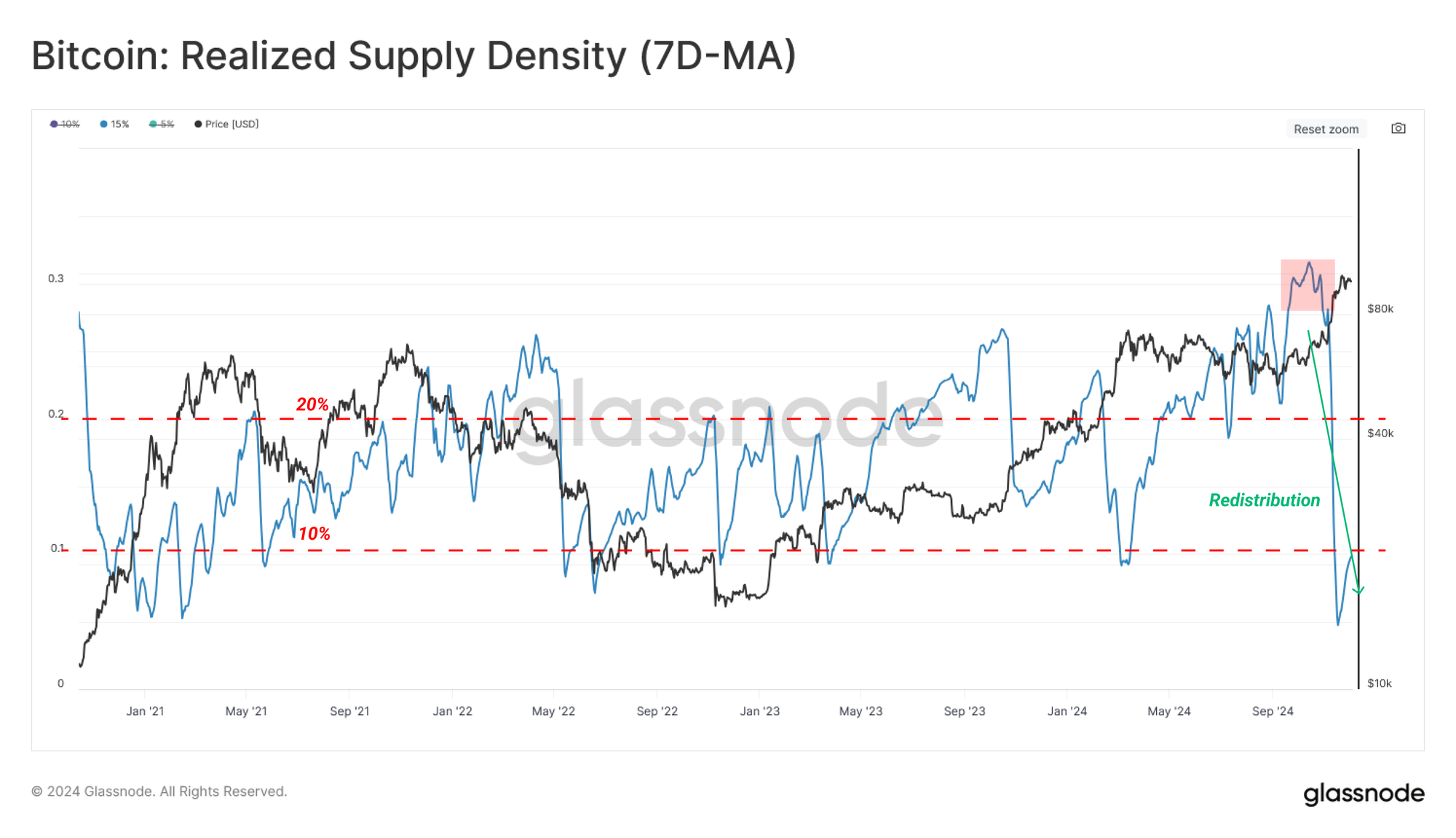 This concentration of supply can heighten the potential for investor panic when downside volatility returns. To track these dynamics, we introduce the Realized Supply Density metric, a tool that quantifies the supply concentration around the current spot price within a ±15% price move.