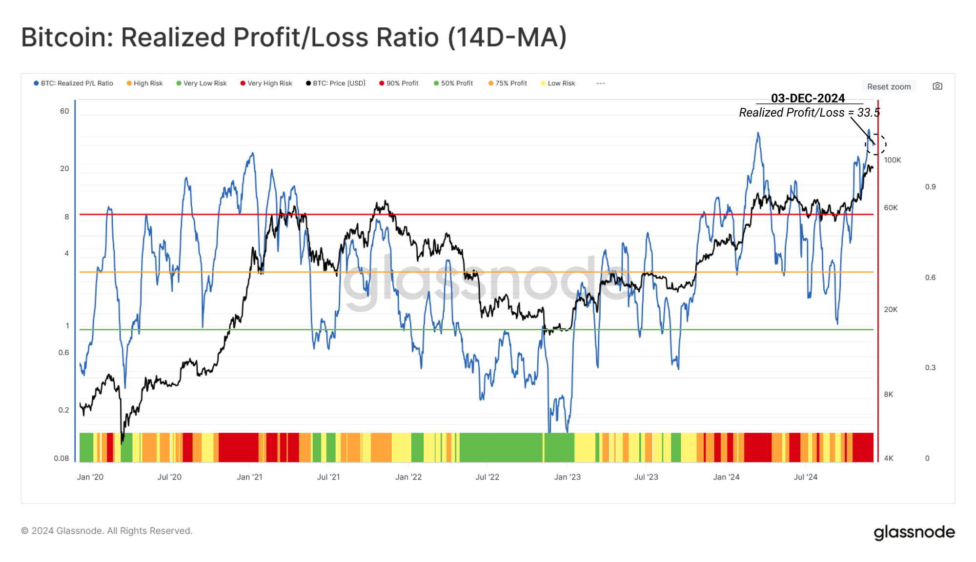 Given the elevated levels of unrealized profit in the system, we can now turn to the Realized Profit and Loss Ratio (RPLR) to gauge how investors adjusted their spending patterns as Bitcoin approached the $100k level.