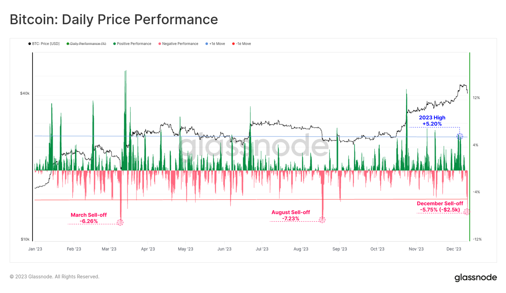The Bitcoin market has performed a round-trip this week, opening at $40.2k, rallying to a new yearly high of $44.6k, before selling off sharply to $40.2k late on Sunday evening. The upside move into the yearly high consisted of two rallies over +5.0%/day (+1 standard deviation moves). The sell-off was equally as powerful, dropping by over $2.5k (-5.75%) making for the third largest one-day down move for 2023.