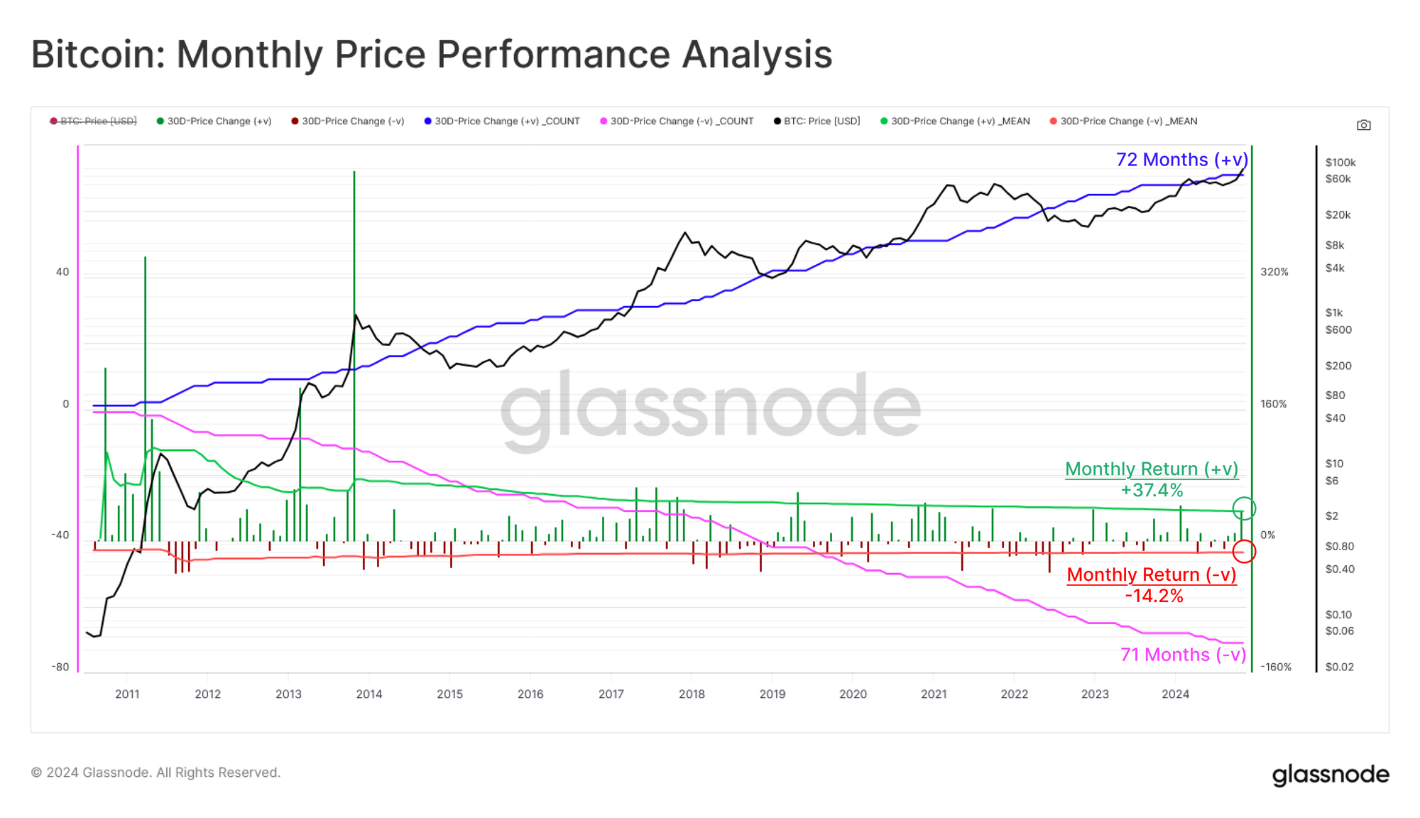 Bitcoin has had an actively traded price for 5,256 days and has travelled from fractions of a cent to $100k. This journey has included 72 positive monthly candles (including December 2024), with an average gain of 37.4%, and 71 negative monthly candles, averaging a decline of -14.2%.
