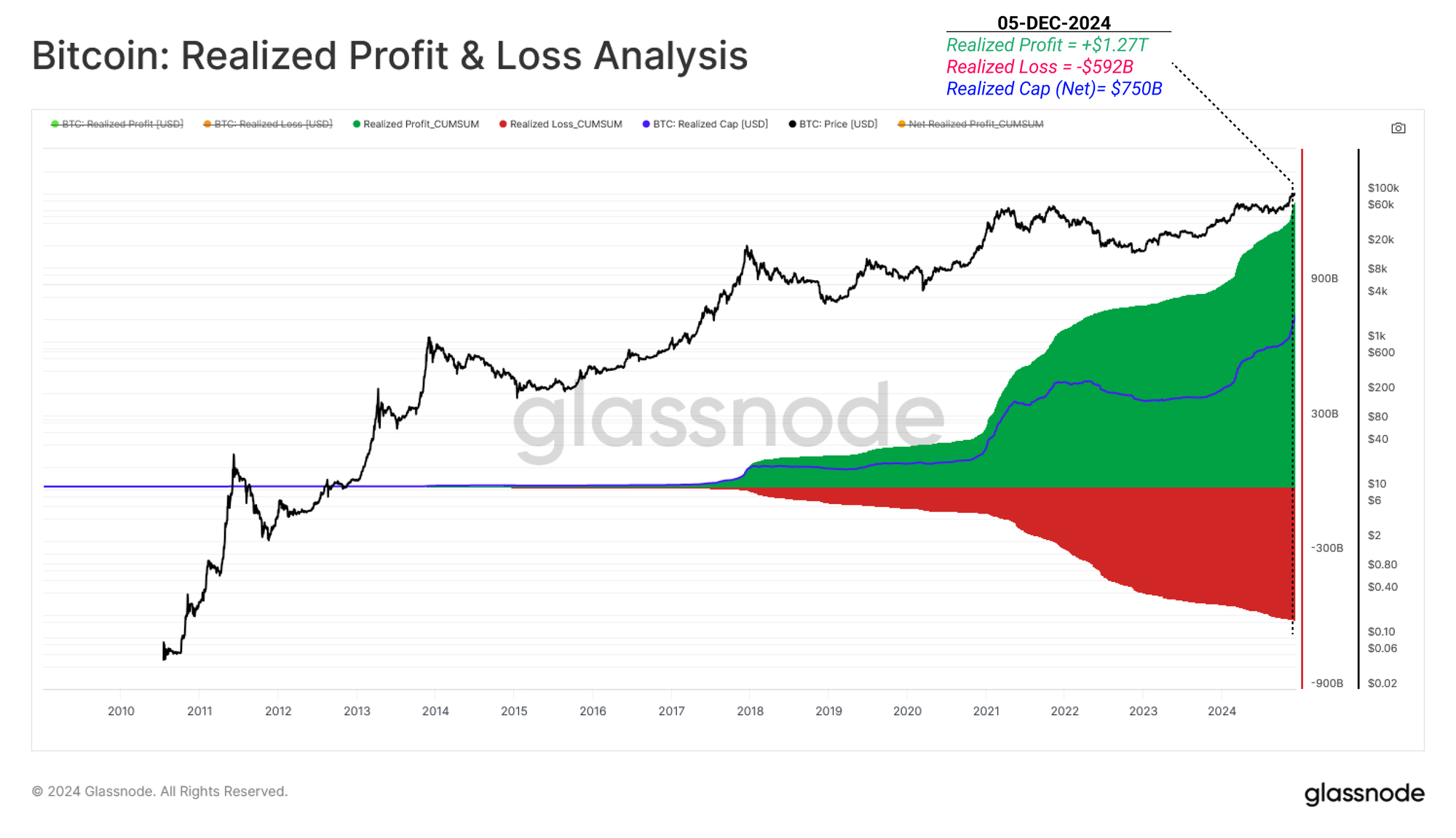 Throughout this period of extraordinary market expansion, investors have realized a total of $1.27 Trillion in profit and -$592 Billion in losses on-chain (based on the delta between acquisition and disposal prices). This resulted in a cumulative net capital inflow (Realized Cap) of $750 Billion and underscores the tremendous value which has flowed into the Bitcoin network over its lifetime.