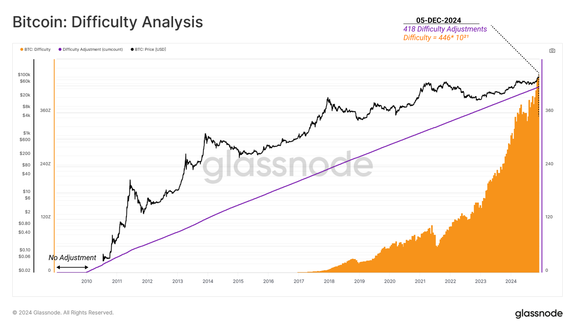 Over the same period, the network difficulty—measured in units that represent the computational effort required to mine a block—has increased dramatically. After 418 difficulty adjustments, excluding the periods without adjustment, network difficulty has increased to 446,331,432,498,125,300,000,000, as the security and computational power behind Bitcoin continue to grow.