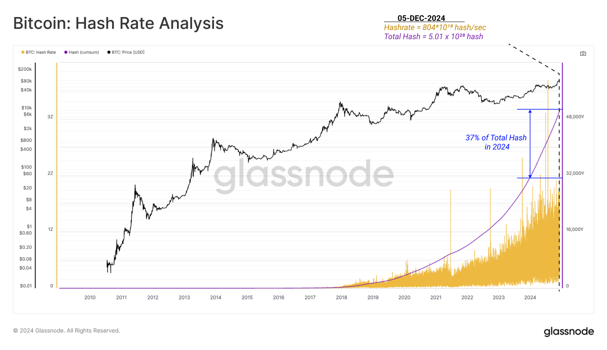 Network hashrate has surged from 128,185 hashes/sec to over 804,407,834,059,443,100,000 hashes/sec by the time Bitcoin reached $100k. Cumulatively, miners have computed approximately 5.01 x 1028 hashes to date. Remarkably, 37% of the total computed hash has occurred throughout 2024.