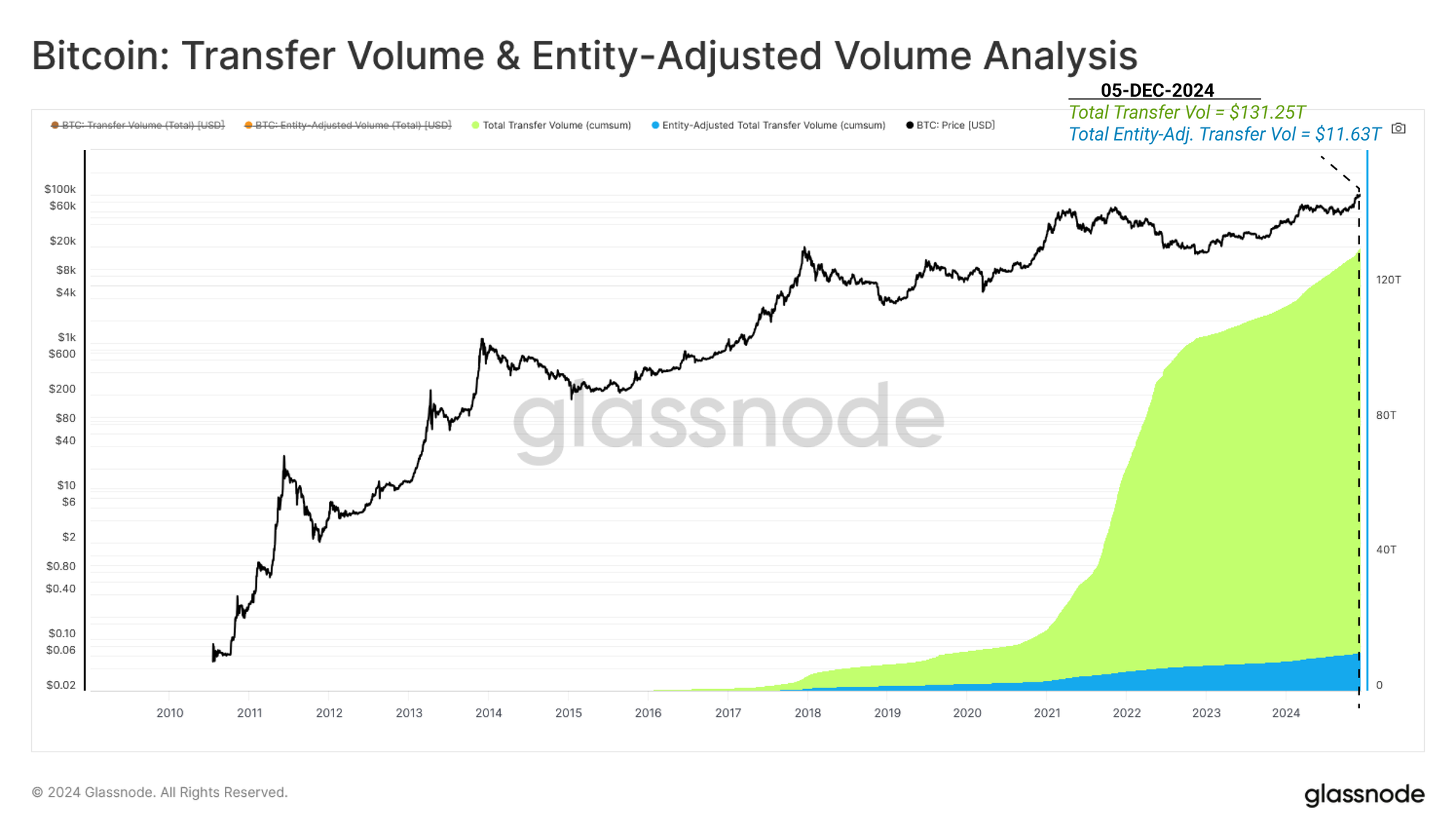 Measuring the dollar value of these transactions at the time of confirmation, the Bitcoin network has cumulatively processed $131.25 Trillion in volume. After applying entity adjustment, the filtered transfer volume stands at $11.63 trillion, just 8.86% of the total.