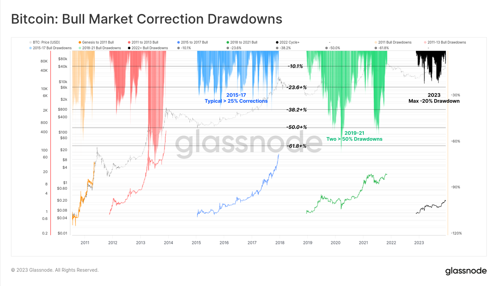 One of the standout features of the 2023 market has been the remarkably shallow depth of all price pullbacks and corrections. Historically, periods of bear market recovery, and bull market uptrends for BTC regularly see at least -25% pullbacks from the local high, with many examples exceeding -50%.