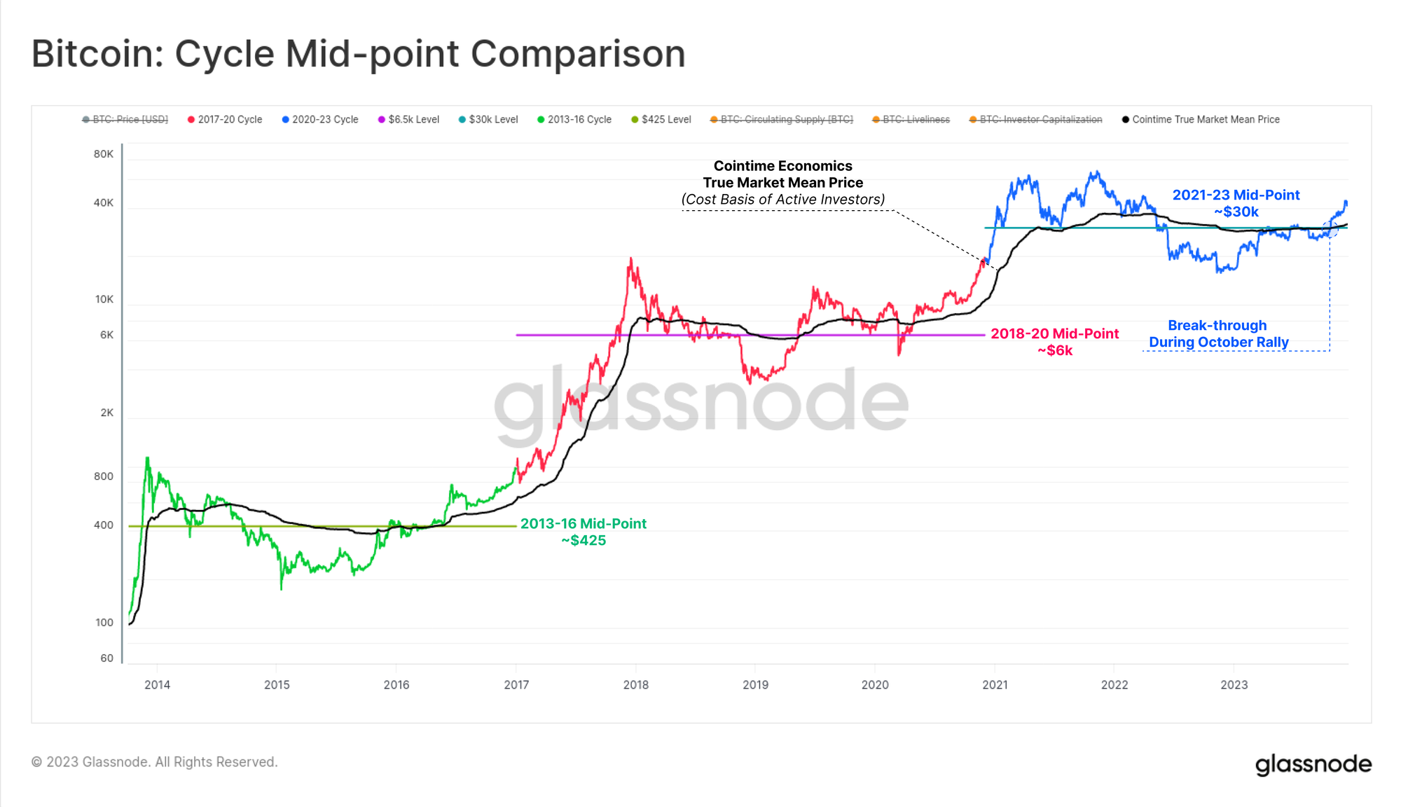 - The technical market mid-point: being a price level broady acting as support during the early bear, and resistance in the late bear. This cycle, $30k was the last major area of support before a series of capitulation sell-offs, culminating with the collapse of FTX.
