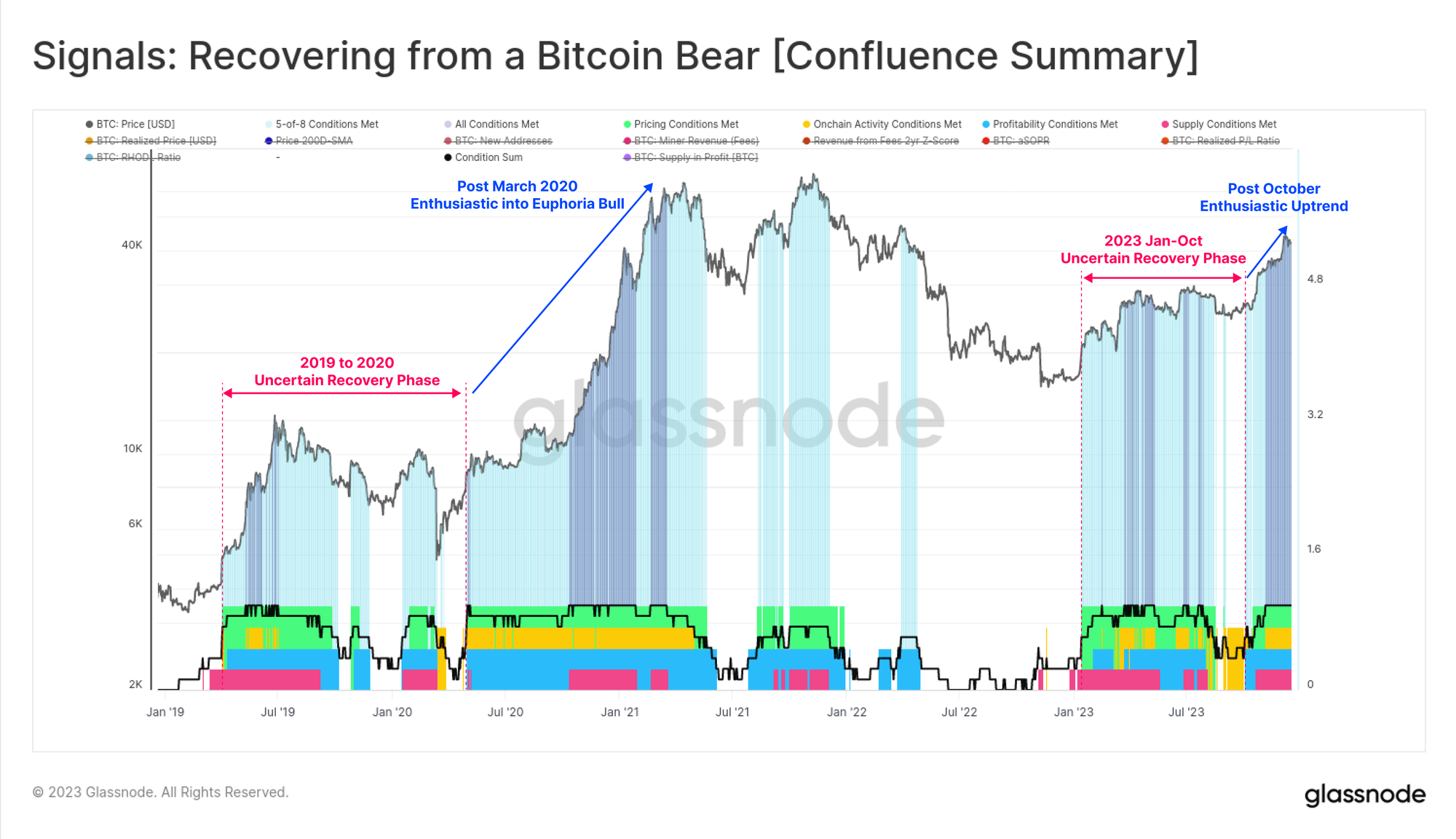 We can also see a marked change in character across our Recovering From a Bitcoin Bear Signal, as all eight indicators have entered positive territory since October. Readings were spotty through most of 2023, displaying a very similar character to the 2019-20 period.