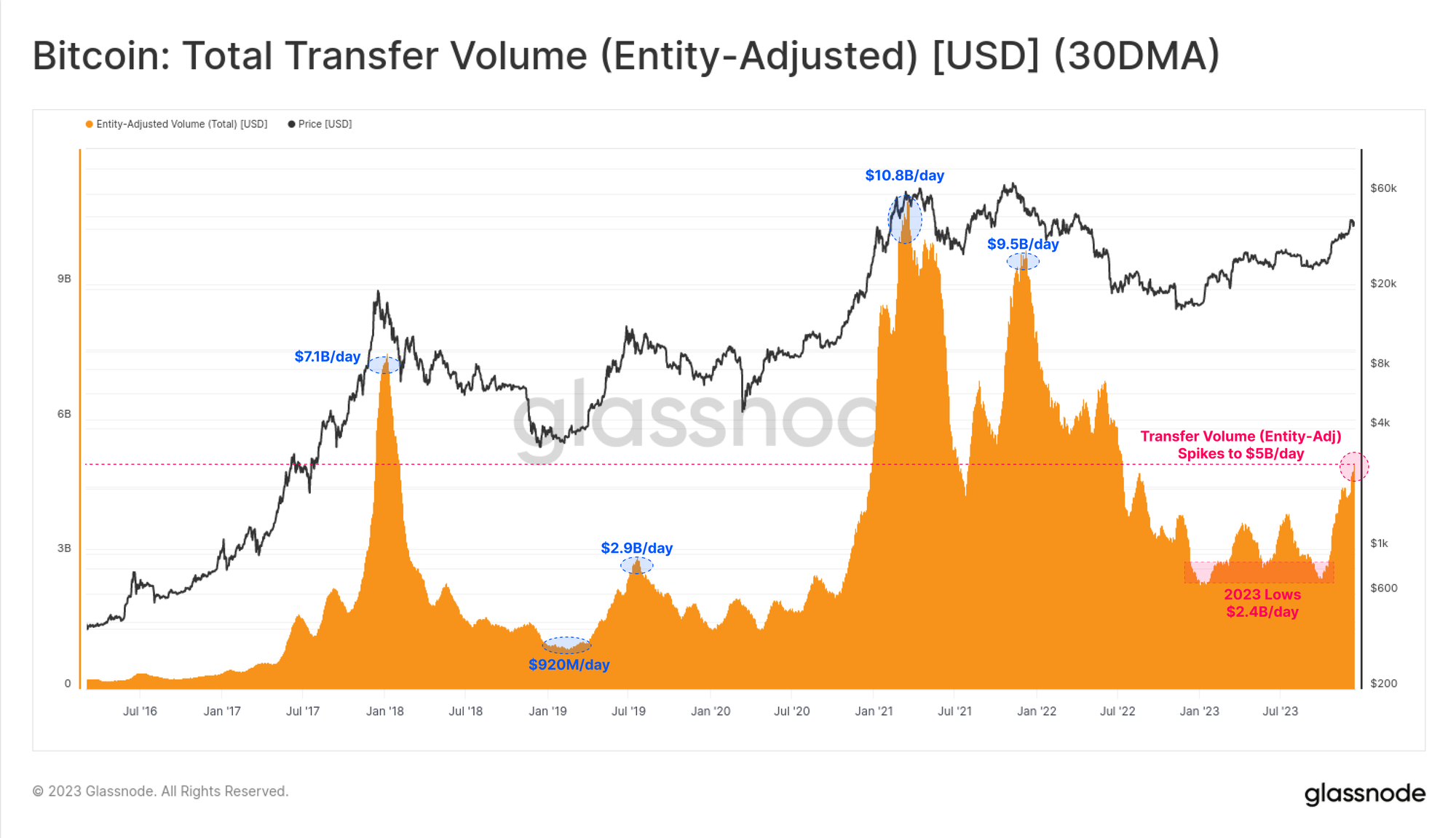 Supporting the notion that October was somewhat of a market phase shift, we can see that transaction volumes for Bitcoin were relatively stagnant up until that point. The October rally motivated transfer volumes for Bitcoin to double from $2.4B/day to a over $5.0B/day, the highest levels since June 2022.