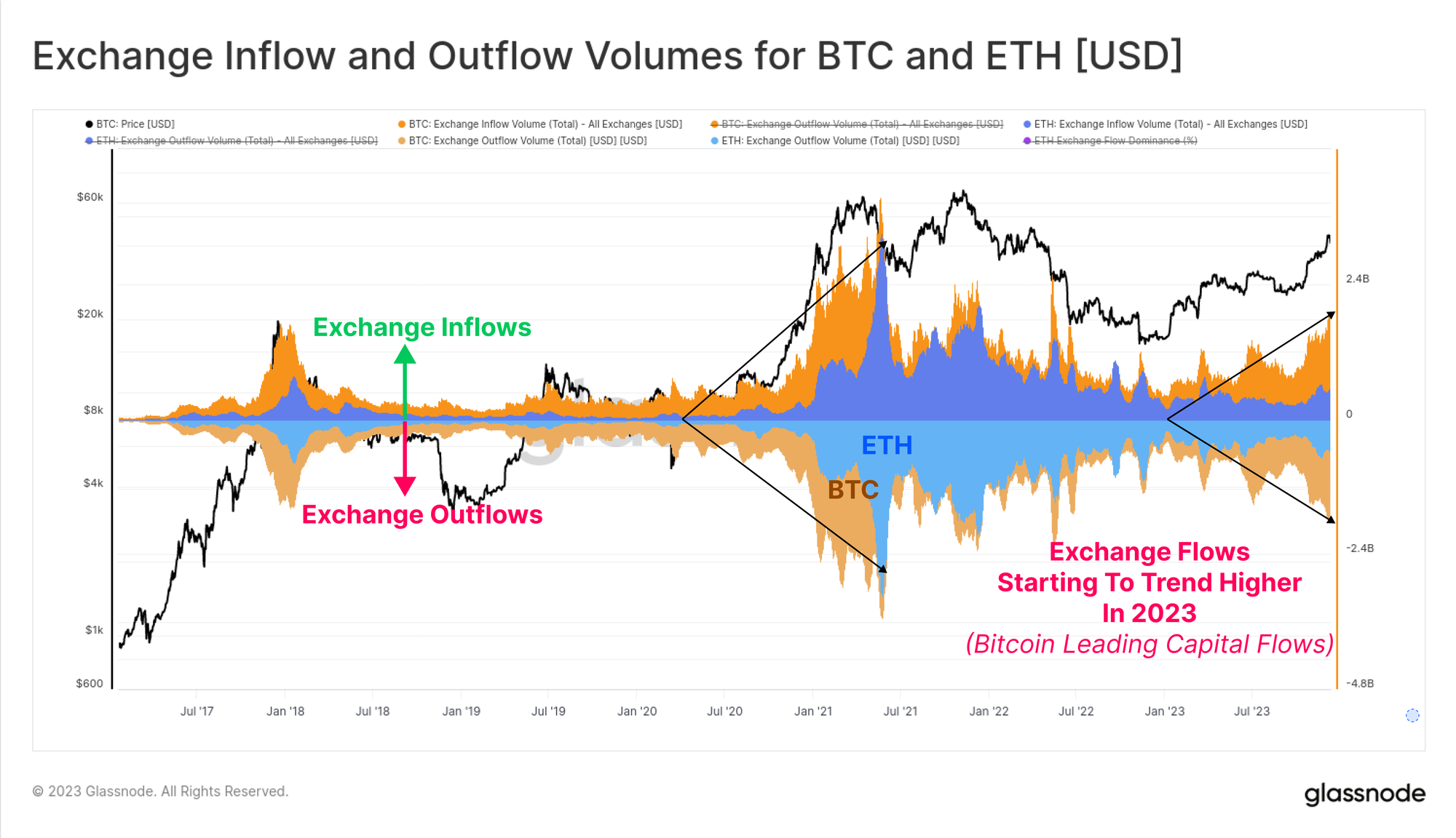 - 2023 has been an incredible year for digital assets, with Bitcoin up over 172%, correcting less than 20%, and net capital inflows into BTC, ETH and Stablecoins.