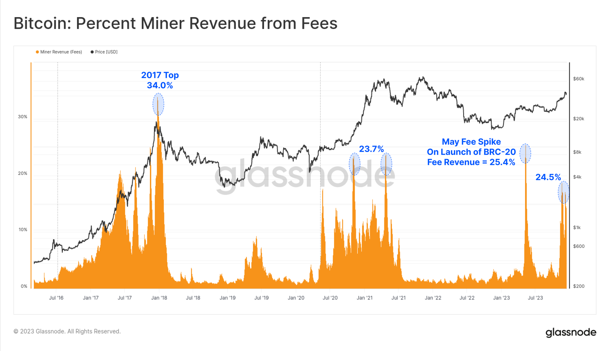As a result of this new buyer of Bitcoin blockspace, miner revenue from fees has increased significantly, with several blocks in 2023 paying fees which even exceeded the 6.25 BTC subsidy. There have been two major fee spikes this year, with fees now accounting for around a quarter of miner revenues. This is on par with the euphoria phases of the 2017 and 2021 bull markets.