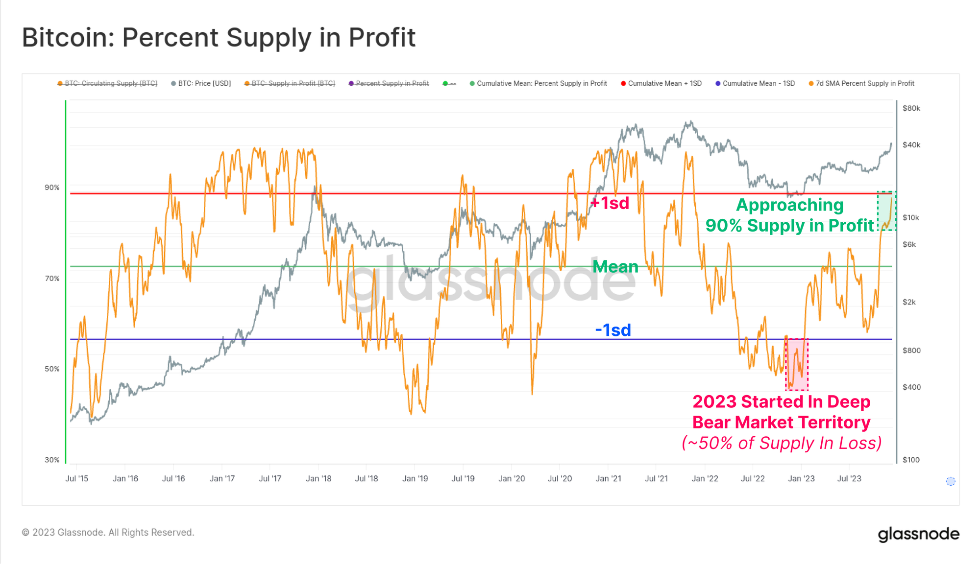 The flip side is that Supply held 'in-profit' is now over 90% of the circulating supply, with the October rally being the event making it above the all-time-mean. Given 2023 started out with over 50% of supply being underwater, this is one of the fastest recoveries in history (second to the rally in 2019).