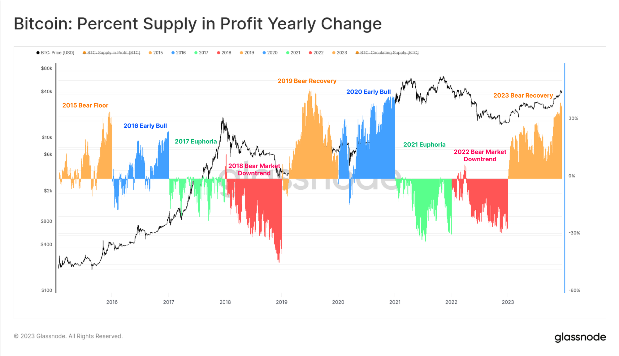 The chart below visualises the change in percent supply in profit over each calendar year since 2015. Whilst the delineation by year isn't perfect, the classic four year Bitcoin cycle allows us to spot some interesting patterns: