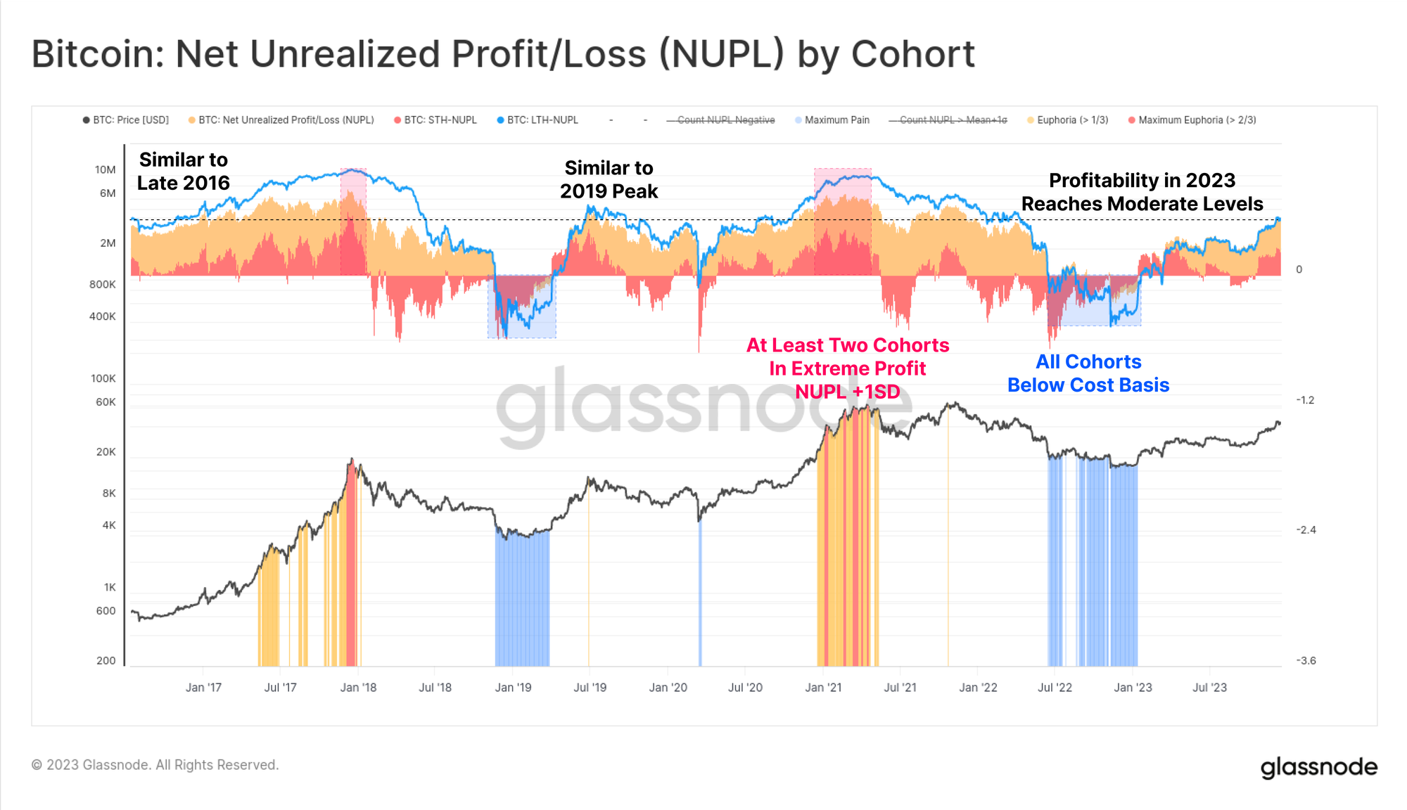 Lastly on the topic of investor profitability, 2023 has taken Long-Term Holders, Short-Term Holders, and the average holder from an unprofitable, to a moderately profitable state. The NUPL metric for each cohort is not yet at euphoric highs, but is also comfortably above the respective cohort break-even level.
