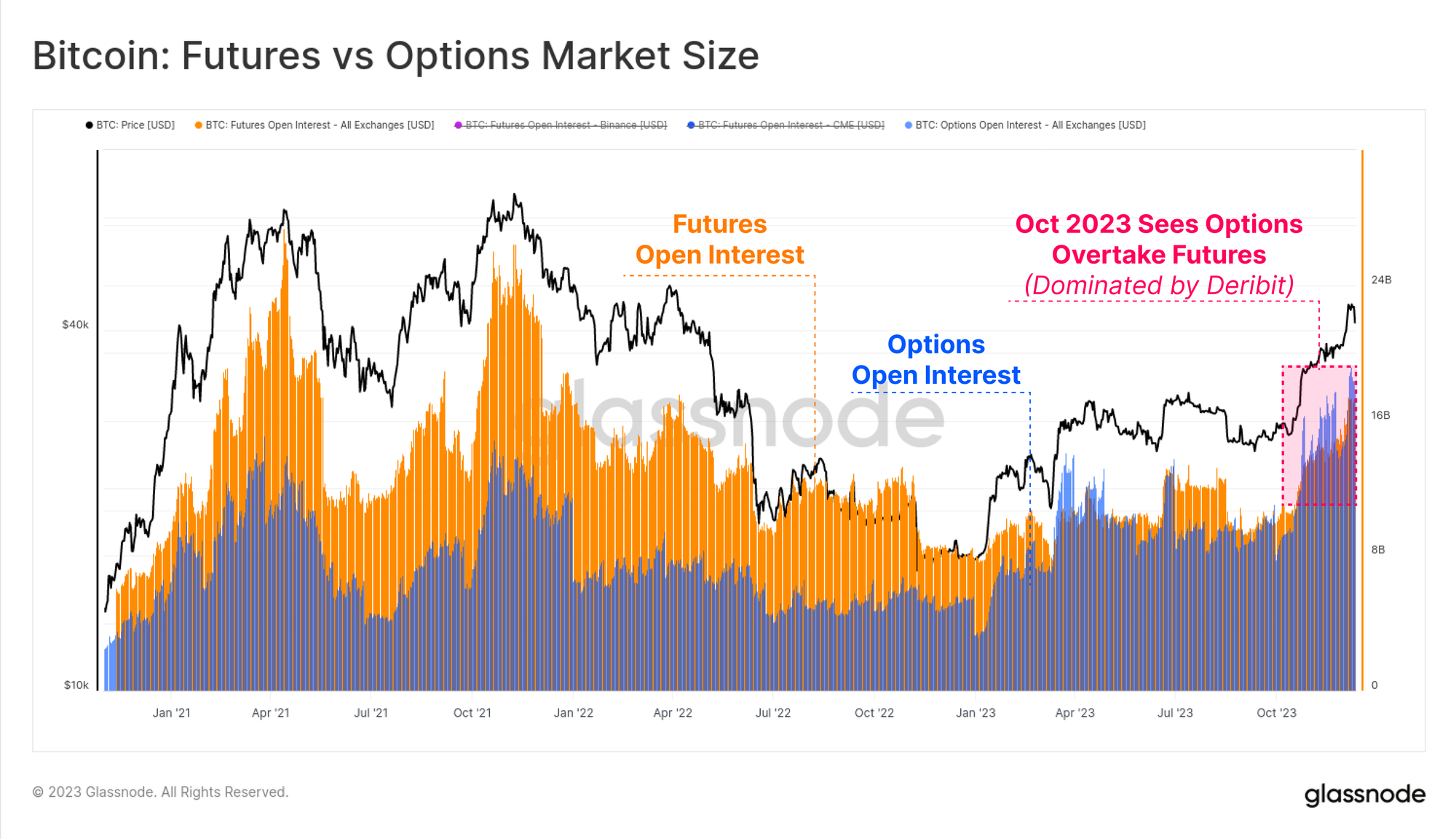 A defining feature of the 2020-23 cycle was the emergence of futures and options markets as the preferred venues for price exposure and liquidity. 2023 has proven to be an important year in this maturation, as Options markets have grown to match and even overtake Futures markets in open interest size.