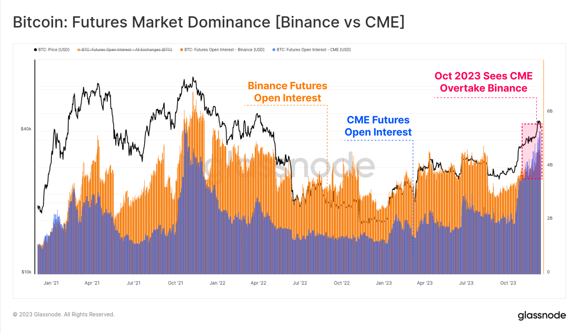 Within the futures market there has also been a noteworthy dominance shift, with open interest held at the regulated CME exchange overtaking offshore exchange Binance for the first time in history. Once again, October appears to have been an important moment for this phase shift, alluding to an influx of institutional capital.