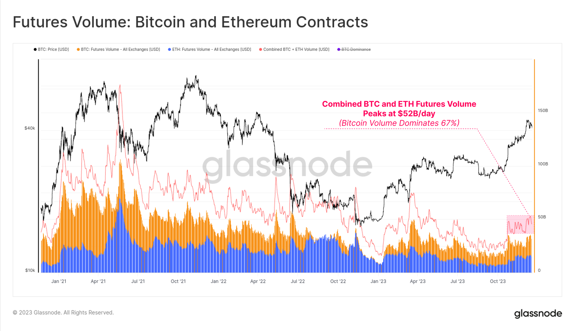 Futures trade volume for both BTC and ETH saw an uptick in October, with a combined daily volume of $52B/day. Bitcoin contracts dominate around 67% of the trade volume, compared to 33% associated with Ether contracts.