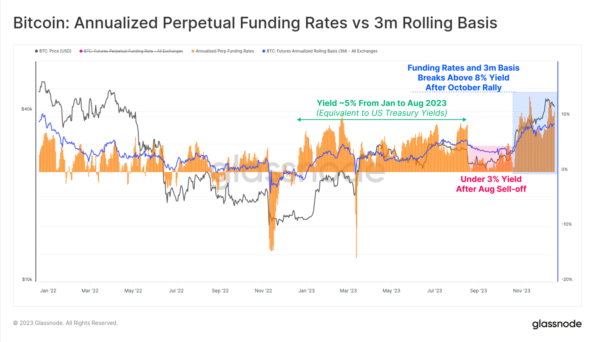 - October onwards as yields break above 8%. With futures basis now maintaining levels 300bps above US Treasuries, market maker capital now has a meaningful incentive to return to the digital asset space.
