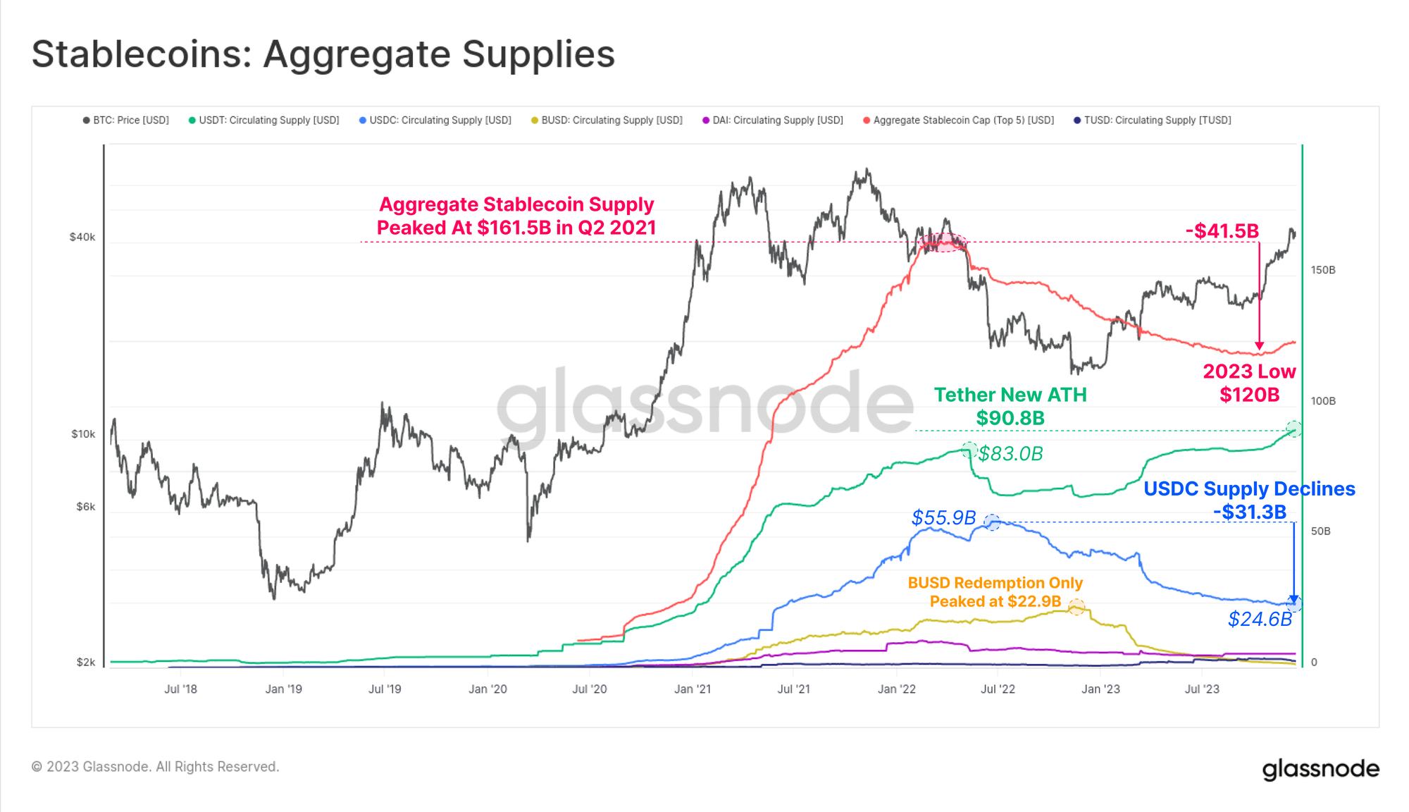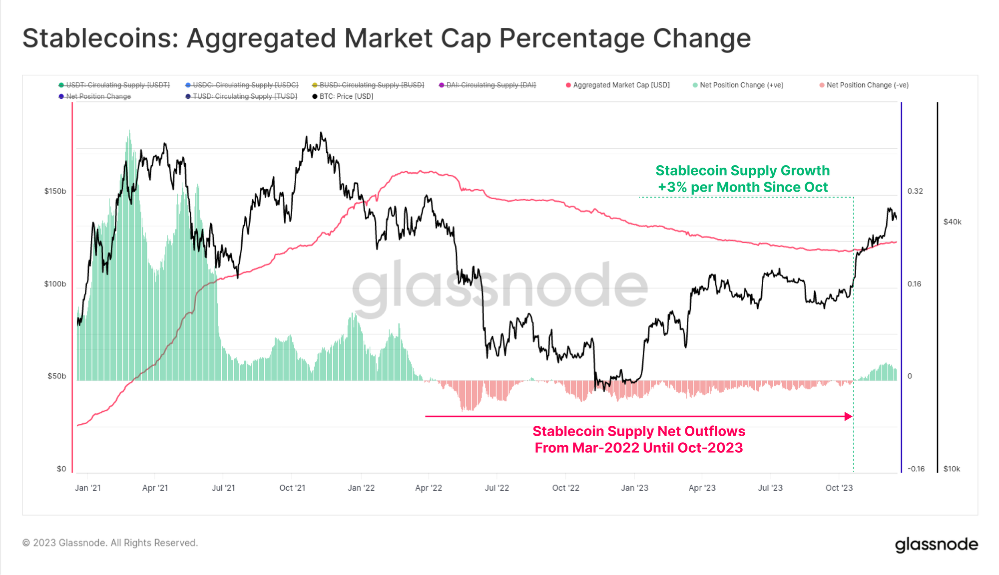 Aggregate stablecoin supplies had been in decline since March 2022, falling by -26% from the peak, being a major headwind for market liquidity. This is due to a combination of regulatory pressures (SEC charged BUSD for being a security), capital rotation (preferring US treasuries vs non-interest bearing stablecoins), and waning investor interest in the bear market.
