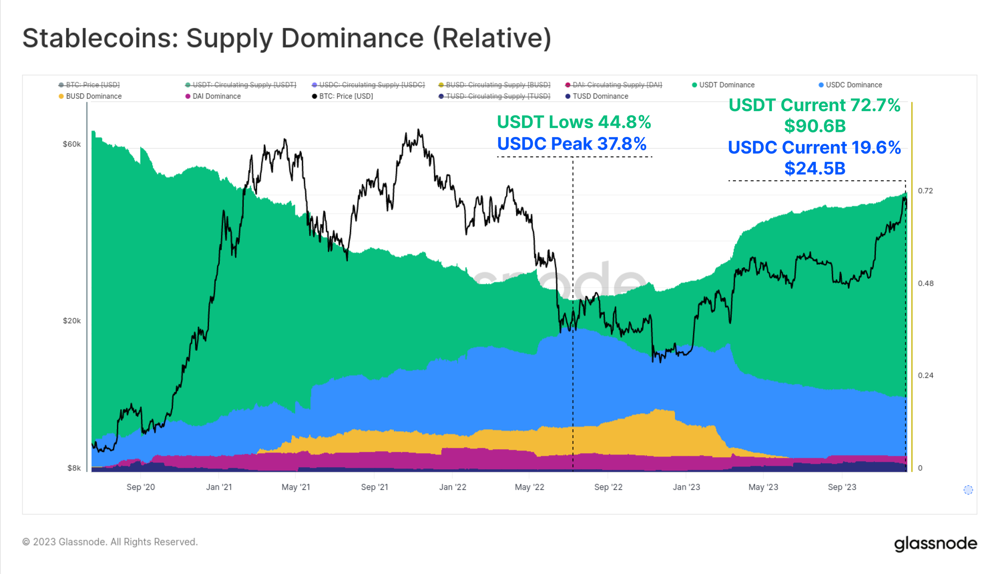 The relative dominance between various stablecoins has also undergone significant shifts between 2022 and 2023. Previously rising stablecoins like USDC and BUSD have seen their dominance shrink significantly, with BUSD entering redemption only mode, and USDC dominance falling from 37.8% to 19.6% since June 2022.