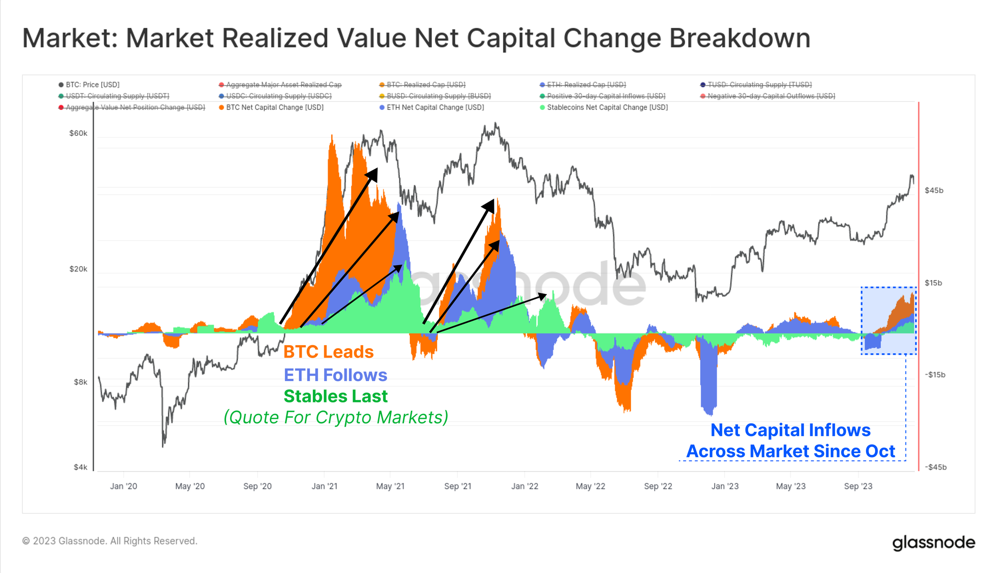 Once again, October stands out as a key moment where capital inflows into all three assets turning positive, aligning with the market breaking above the key $30k level, institutional interest expanding in derivatives markets, and net capital inflows to the three major digital assets.