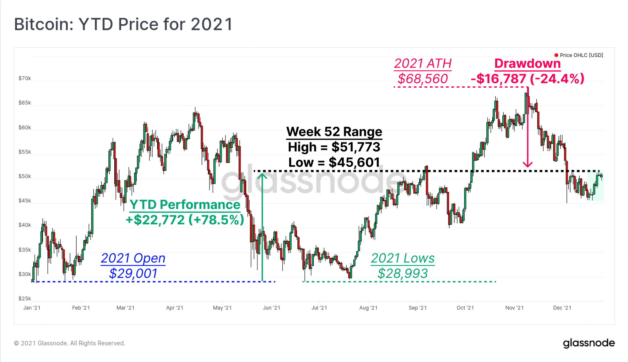 For our final newsletter of the year, we will provide a brief 2021 review of some year-to-date changes across both on-chain, exchange, derivatives, and mining datasets. When looking back at 2021, it interestingly appears to be a year best described as a macro, high time-frame consolidation, albeit a volatile one. The year-to-date summary for Bitcoin is: