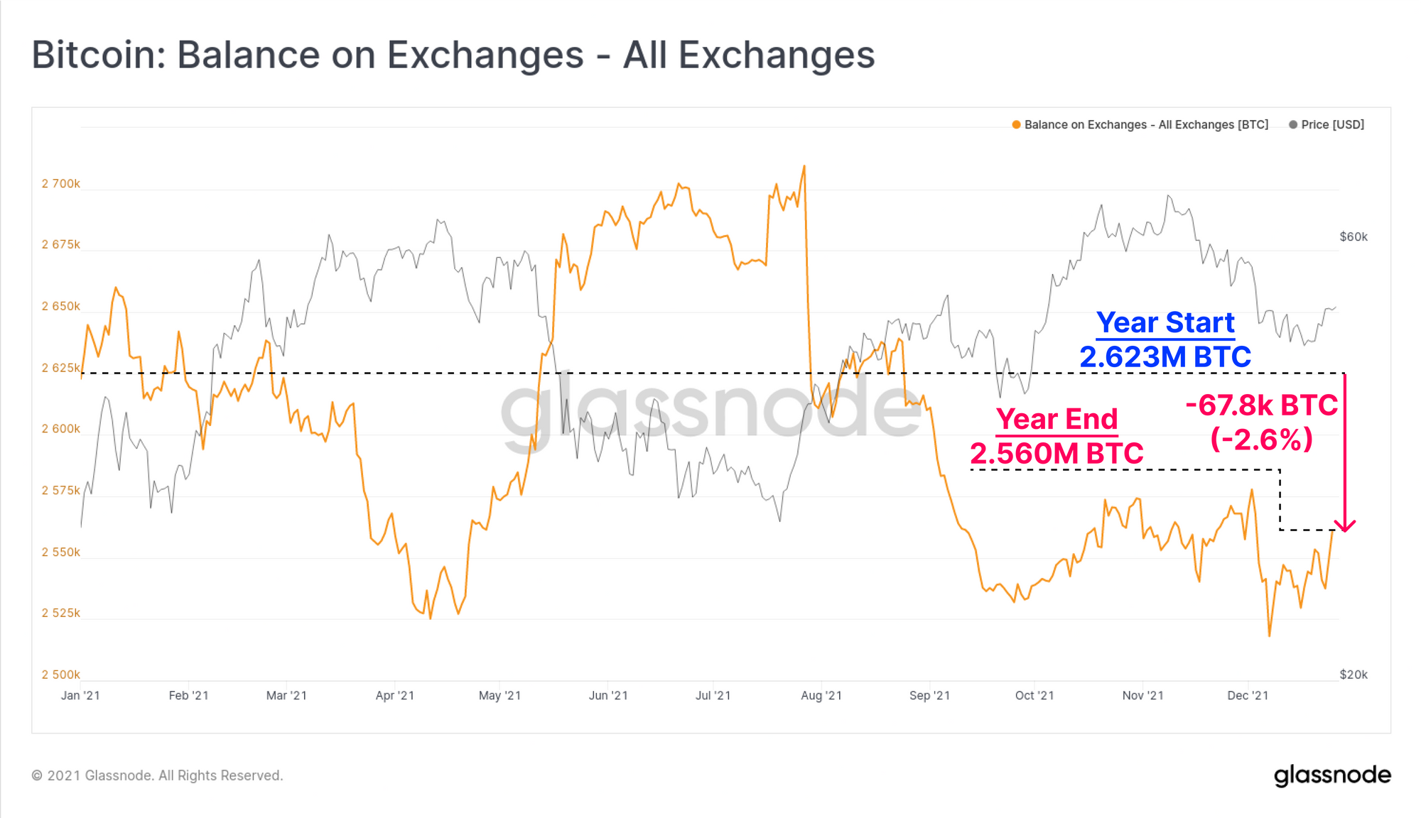 - Exchange balances saw a net yearly outflow of 67.8k BTC, a decline of just 2.5%.