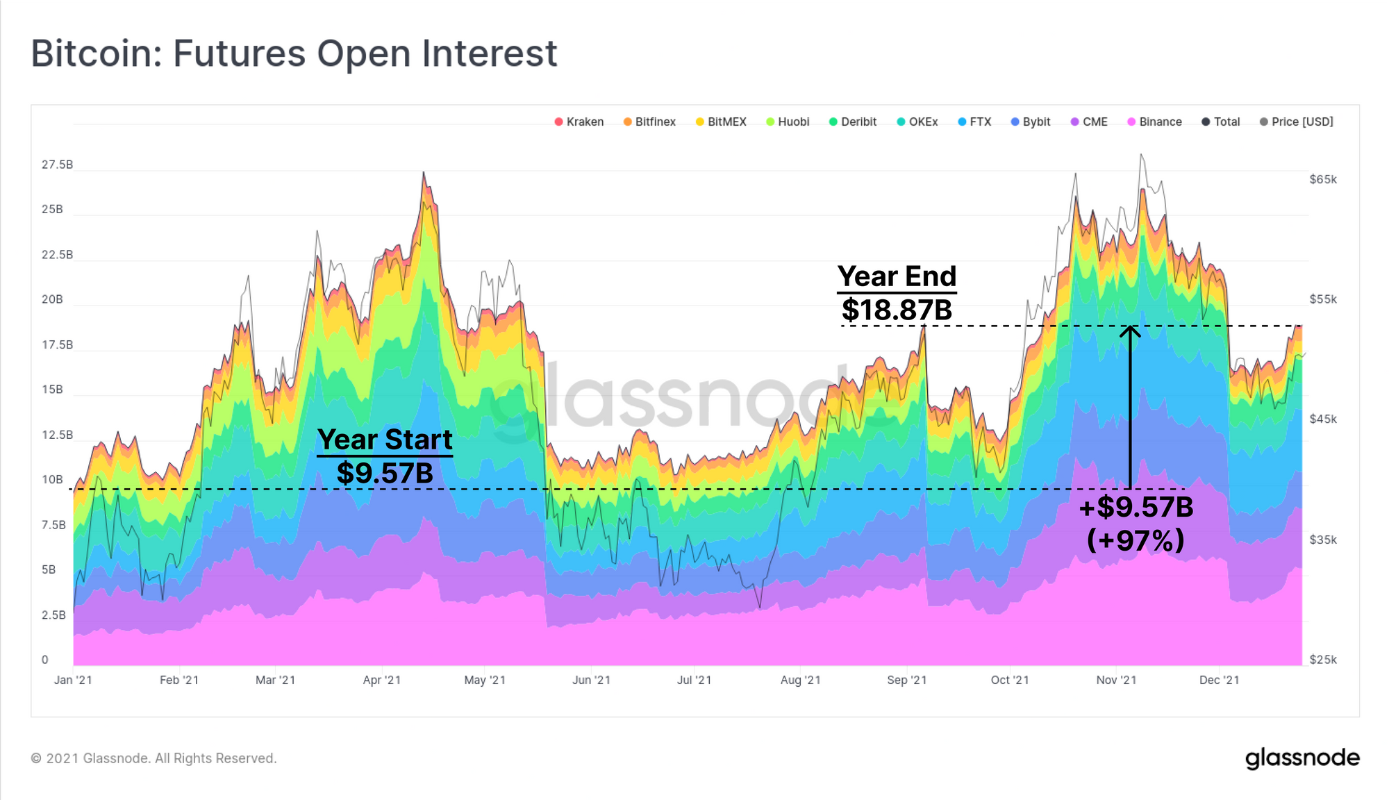- Futures Open Interest almost doubled, increasing by $9.57B (97%) whilst futures trading volume actually declined by 16% to $36.7B/day.