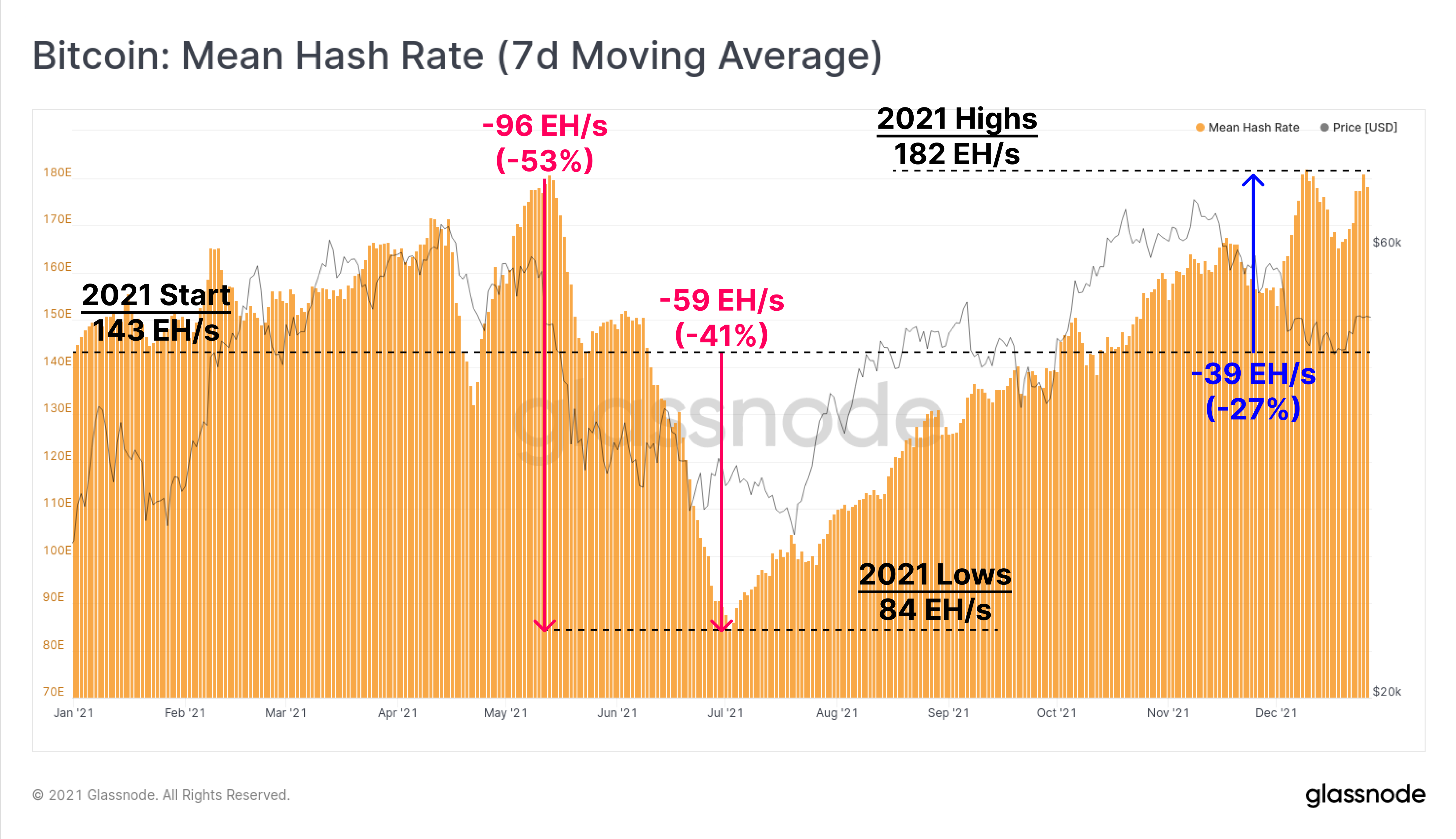 - Mining hash-rate has finished 2021 up 27% on the year, after recovering entirely from the great migration where around 53% of miners were shut-off almost overnight.