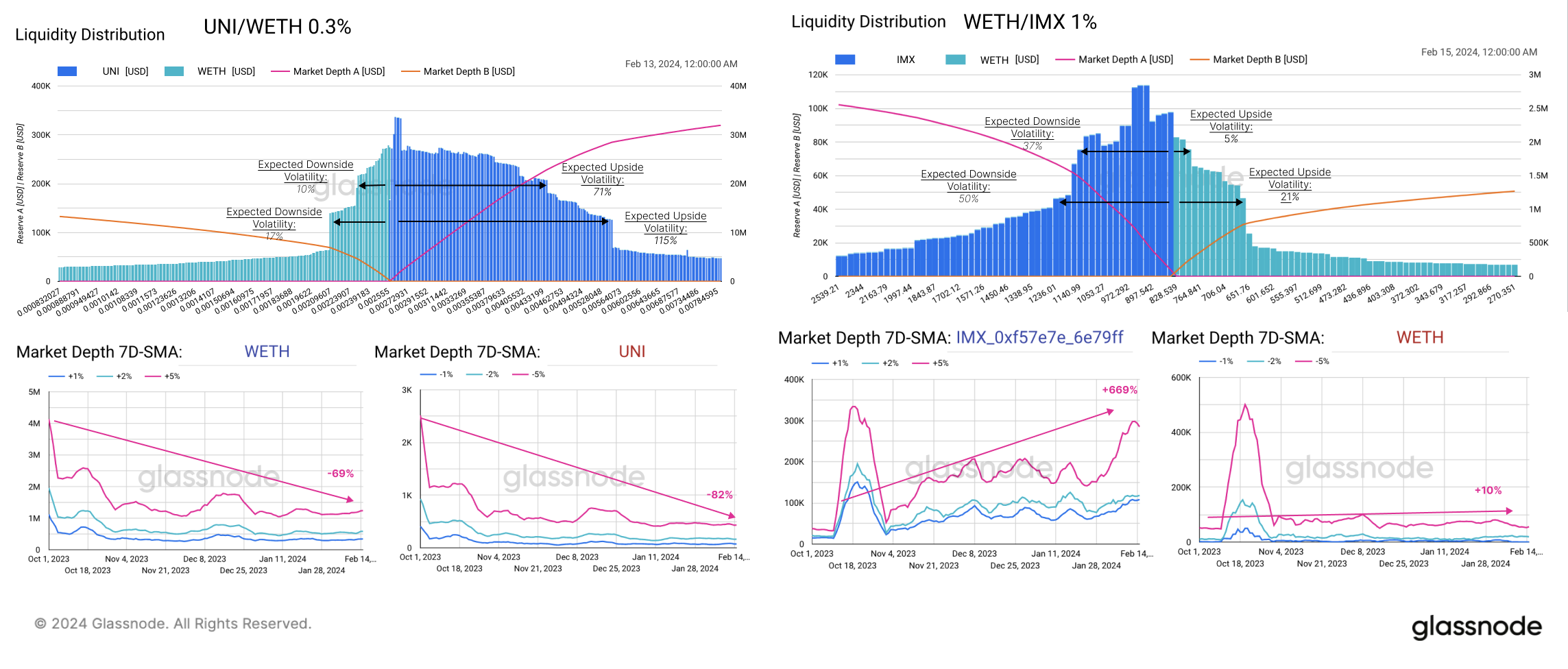 Altcoin ve WETH rezervi arasındaki dağılım iyi dengelenmiştir ve beklenen yukarı yönlü volatilite biraz daha yüksektir. Bu durum, Likidite Sağlayıcıların bu tokenlar için genel olarak yükseliş eğiliminde olduğunu göstermektedir. Bunun istisnası GameFi tokenı IMX'tir.