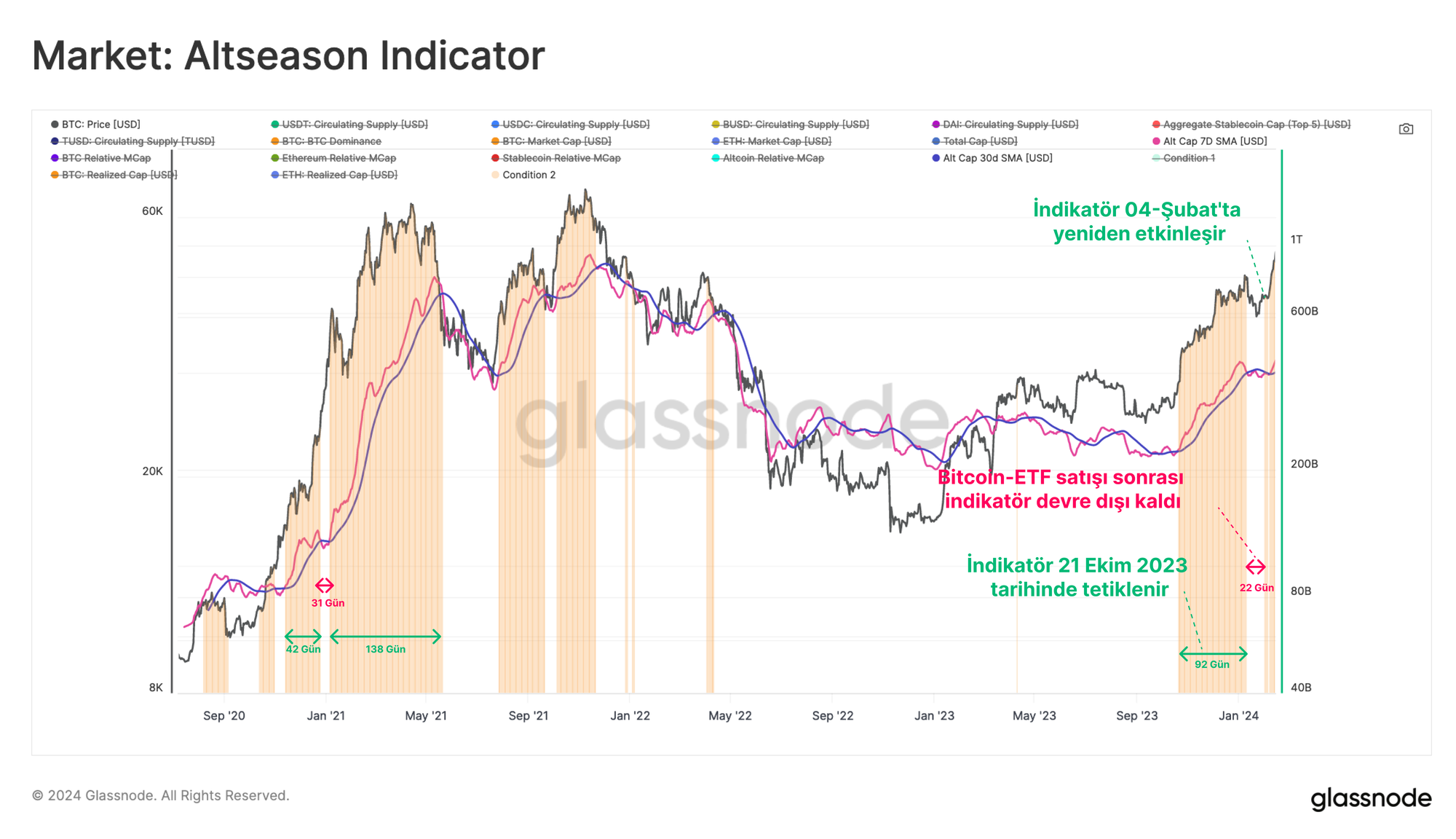 Altcoin Göstergemiz geçen yılın Ekim ayından bu yana, Bitcoin-ETF'lerin hayata geçmesinin ardından yaşanan haber satma olayı sırasında kısa bir duraklama ile pozitif ivme sinyali verdi. 4-Şubat'ta yeniden tetiklendi.