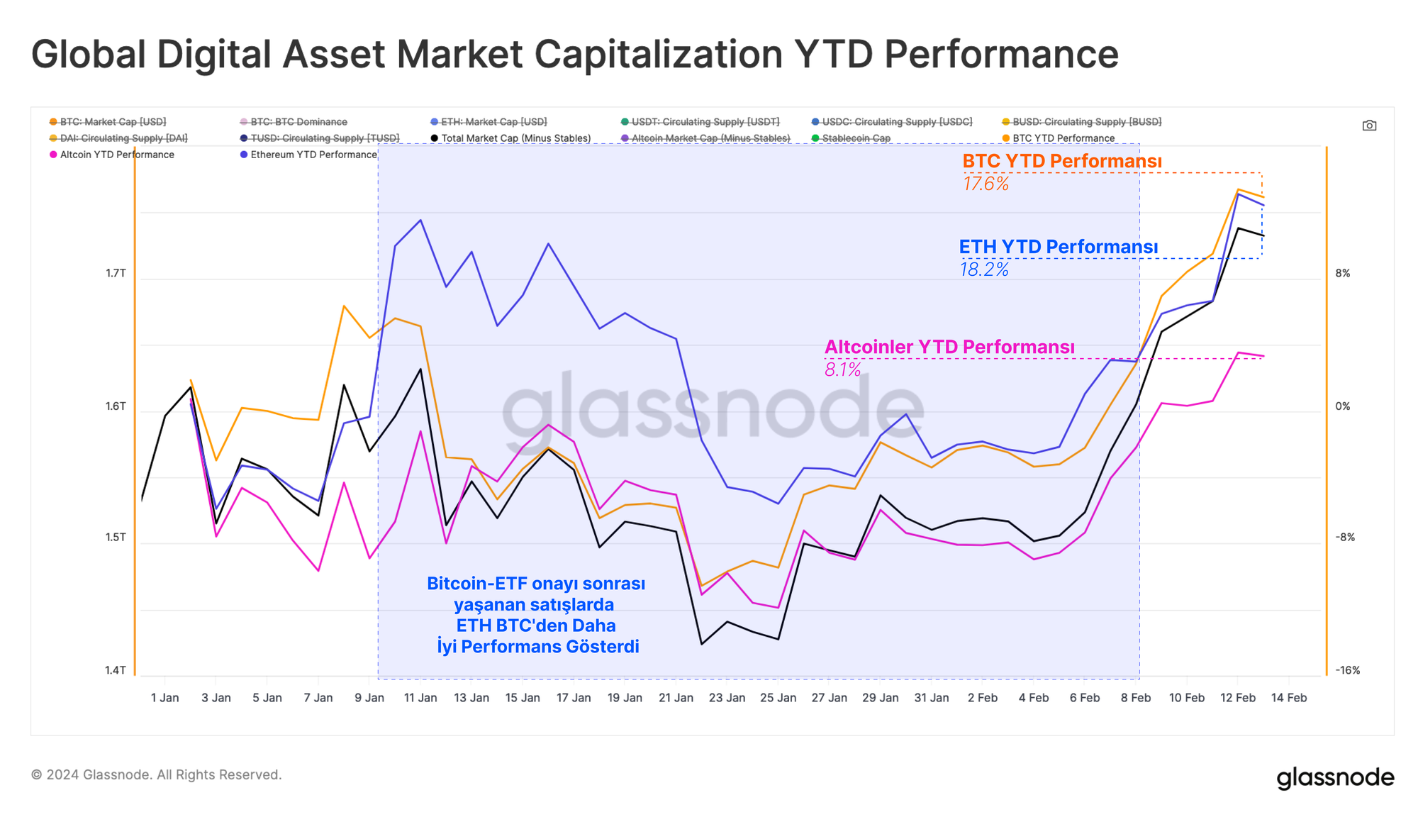 Varlık performansı açısından BTC ve ETH, sırasıyla +%17,6 ve +%18,2'lik YTD kazançlarıyla başı çekiyor. Bitcoin ETF'sinin onaylanmasının ardından ETH'nin BTC'den daha iyi performans göstermeye başladığını ve bunun 2023 yılı boyunca görülen göreceli düşük performanstan farklılık gösterdiğini belirtmek isteriz.